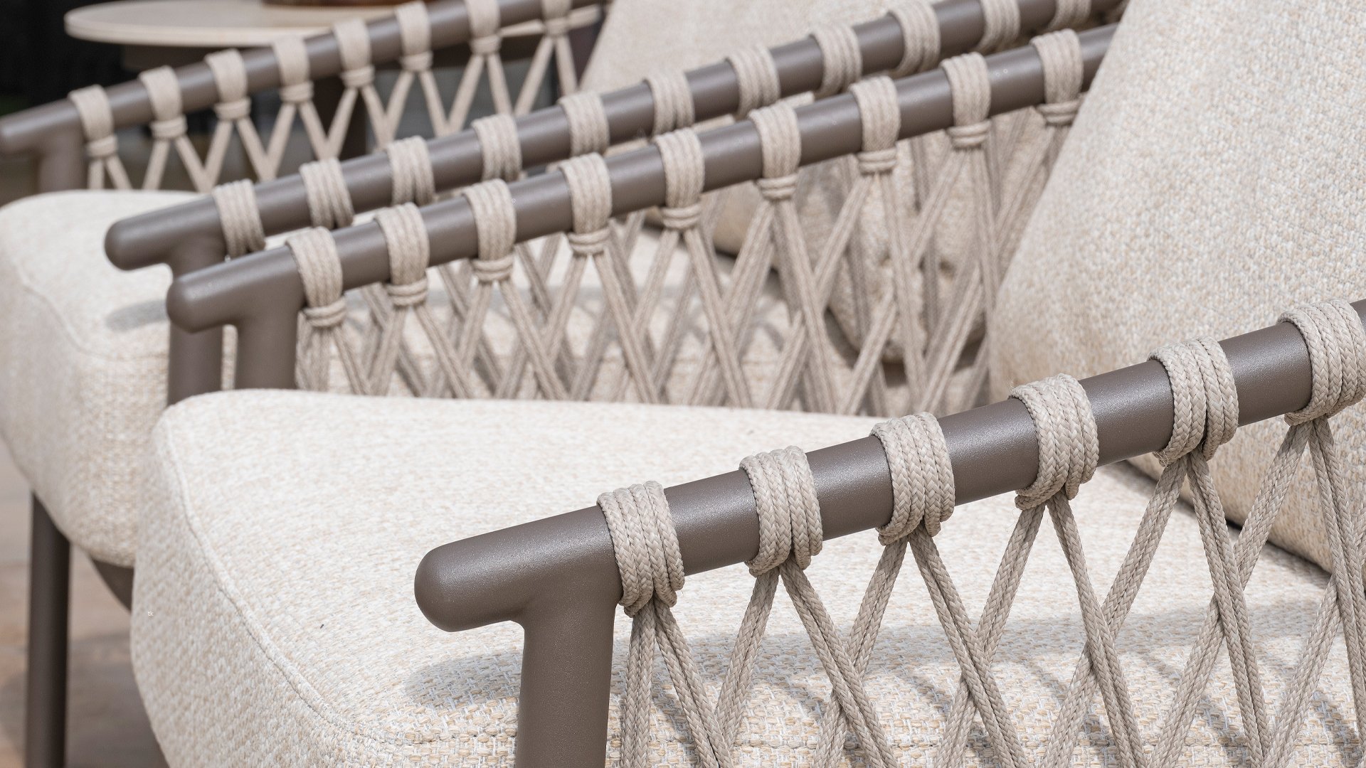 Dit prachtige materiaal is perfect voor buitengebruik, want Taste Rope is niet zo maar een gewone veter waar u uw schoenen mee strikt. Taste gebruikt zeer hoge kwaliteits Rope gemaakt van 100% SDP (Slution Dyed Polypropylene). Dit materiaal is extreem sterk en heeft een zeer klein rekbaarheids percentage. Polyproylene is op olie basis waardoor vuil en verontreiniging nauwelijks in kan dringen, net als onze kussens. Taste biedt exclusieve designs, waarbij hand geweven Rope patronen en technieken worden gebruikt.