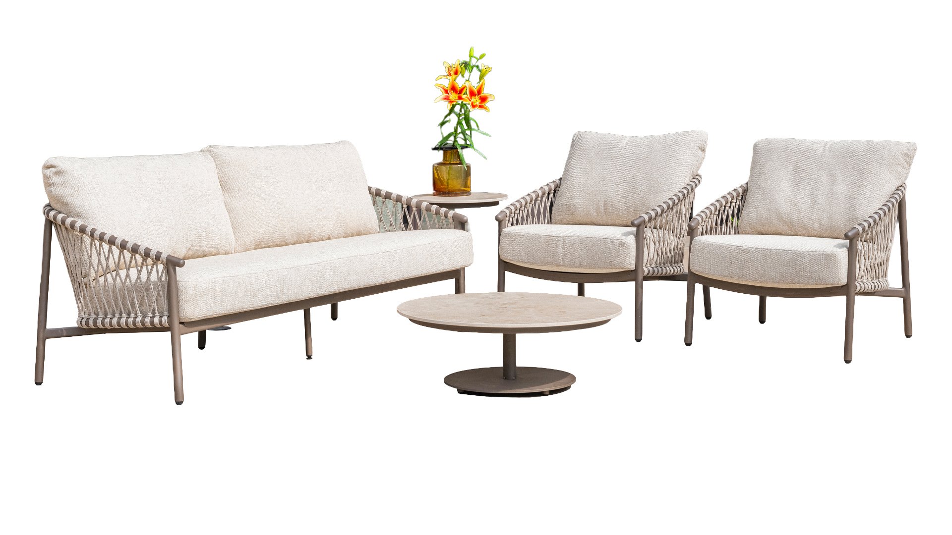 Ontdek de ultieme balans tussen stijl en comfort met onze Allora Terra metallic loungeset met grijs rope, perfect voor je tuin. De 4SO Allora heeft een strak, metalen frame in een luxe bronzen tint. Dit voegt een moderne, verfijnde touch toe aan je buitenruimte. Het zachte grijze rope biedt niet alleen een elegant contrast, maar zorgt ook voor uitzonderlijk comfort en duurzaamheid. De 4Seasons Allora loungesets zijn weerbestendig, onderhoudsvriendelijk en ontworpen om de hele zomer lang je favoriete plek te zijn om te relaxen. Transformeer je tuin in een oase van rust en stijl – de perfecte lounge voor buiten!
