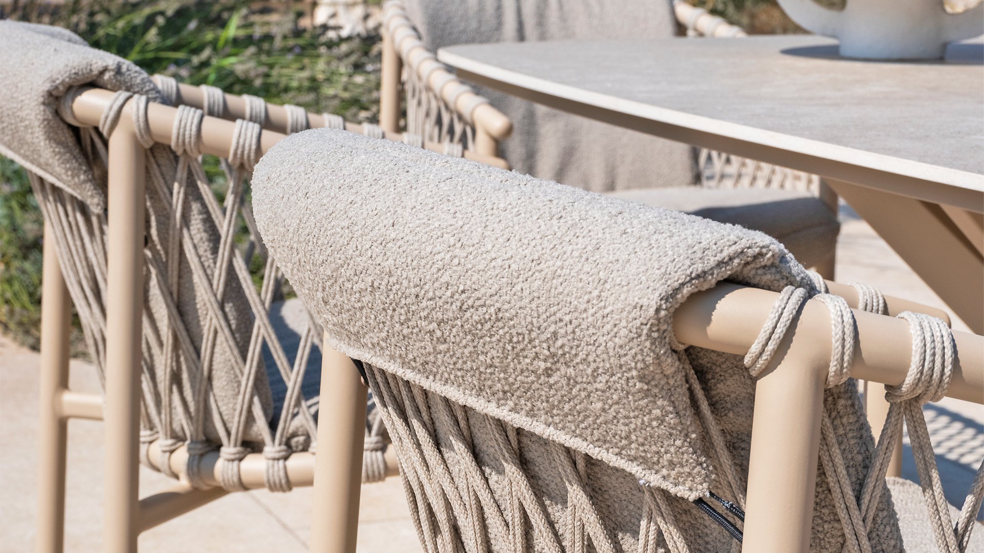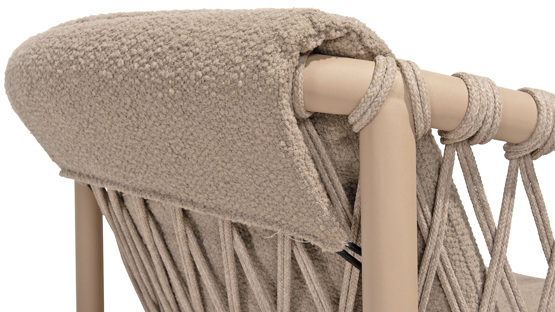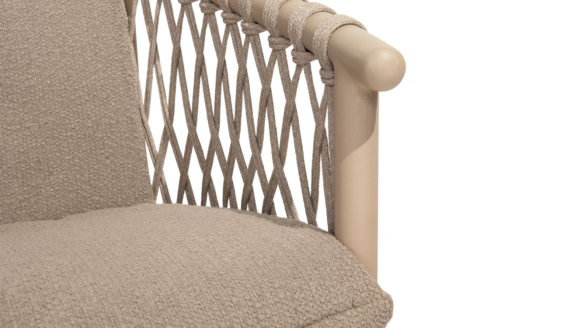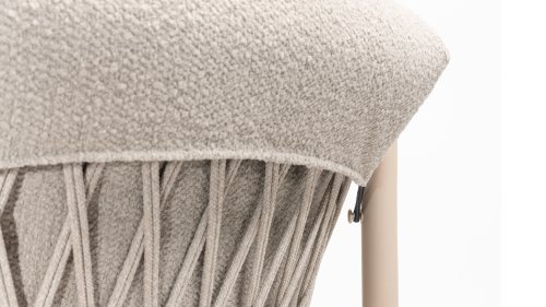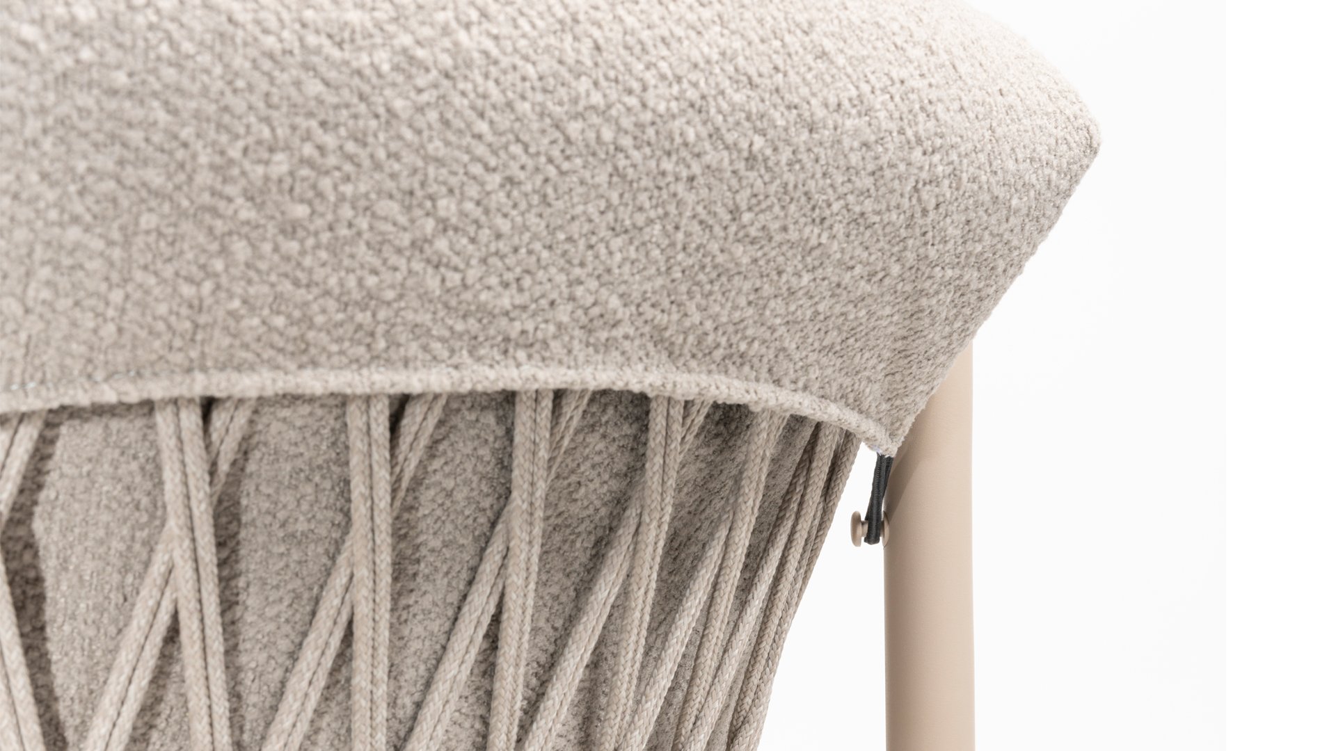 De stof van de zitting is gemaakt van Olefin, een synthetisch materiaal dat bekend staat om zijn stevigheid en weerbestendigheid. De Bouclé Clay stoffering voegt een luxueuze en zachte textuur toe, die zowel esthetisch aantrekkelijk als praktisch is.