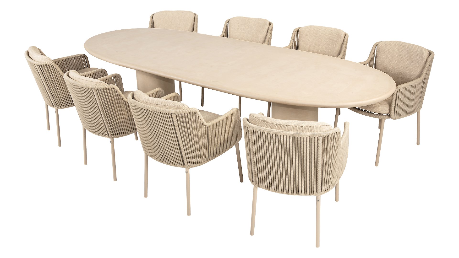 De tafel is verkrijgbaar in diverse formaten, zodat er altijd een Hampton is die bij jouw buitenleven past. Kies voor de ronde Ø160cm variant voor een gezellige setting met één elegante middenpoot, of ga voor de royale ovale uitvoering van 240cm of 300cm, beide voorzien van twee strakke, verticale poten die zorgen voor stabiliteit en een krachtig lijnenspel. Voor wie graag wat lager dineert, is er ook een low dining-versie van Ø160cm, ideaal voor ontspannen momenten in lounge-stijl.