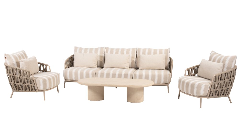 Het frame is gemaakt van sterk gepoedercoat aluminium in een warme zandtint en afgewerkt met met de hand gevlochten Rope in een strak patroon. De dikke kussens bieden niet alleen een luxueuze uitstraling, maar ook uitstekend zitcomfort. De Olefin kussenhoezen zijn weerbestendig, kleurvast en sneldrogend – ideaal voor het Nederlandse klimaat.