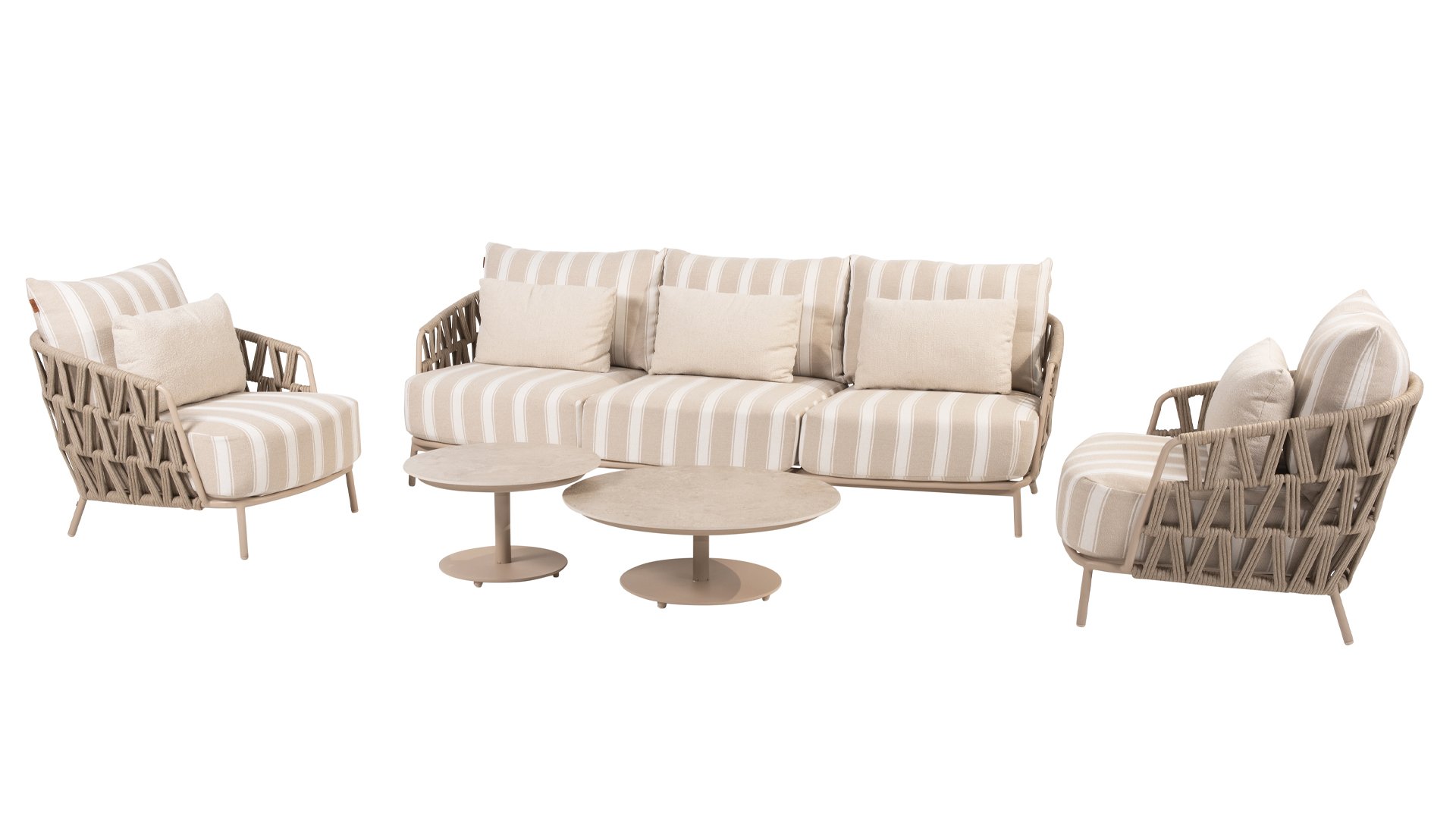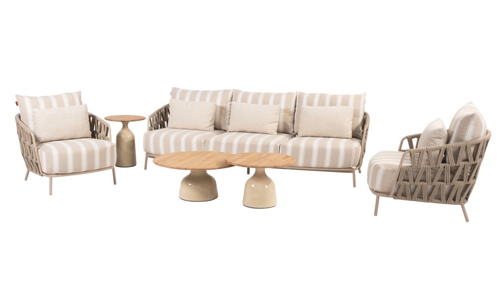 Het frame is gemaakt van sterk gepoedercoat aluminium in een warme zandtint en afgewerkt met met de hand gevlochten Rope in een strak patroon. De dikke kussens bieden niet alleen een luxueuze uitstraling, maar ook uitstekend zitcomfort. De Olefin kussenhoezen zijn weerbestendig, kleurvast en sneldrogend – ideaal voor het Nederlandse klimaat.