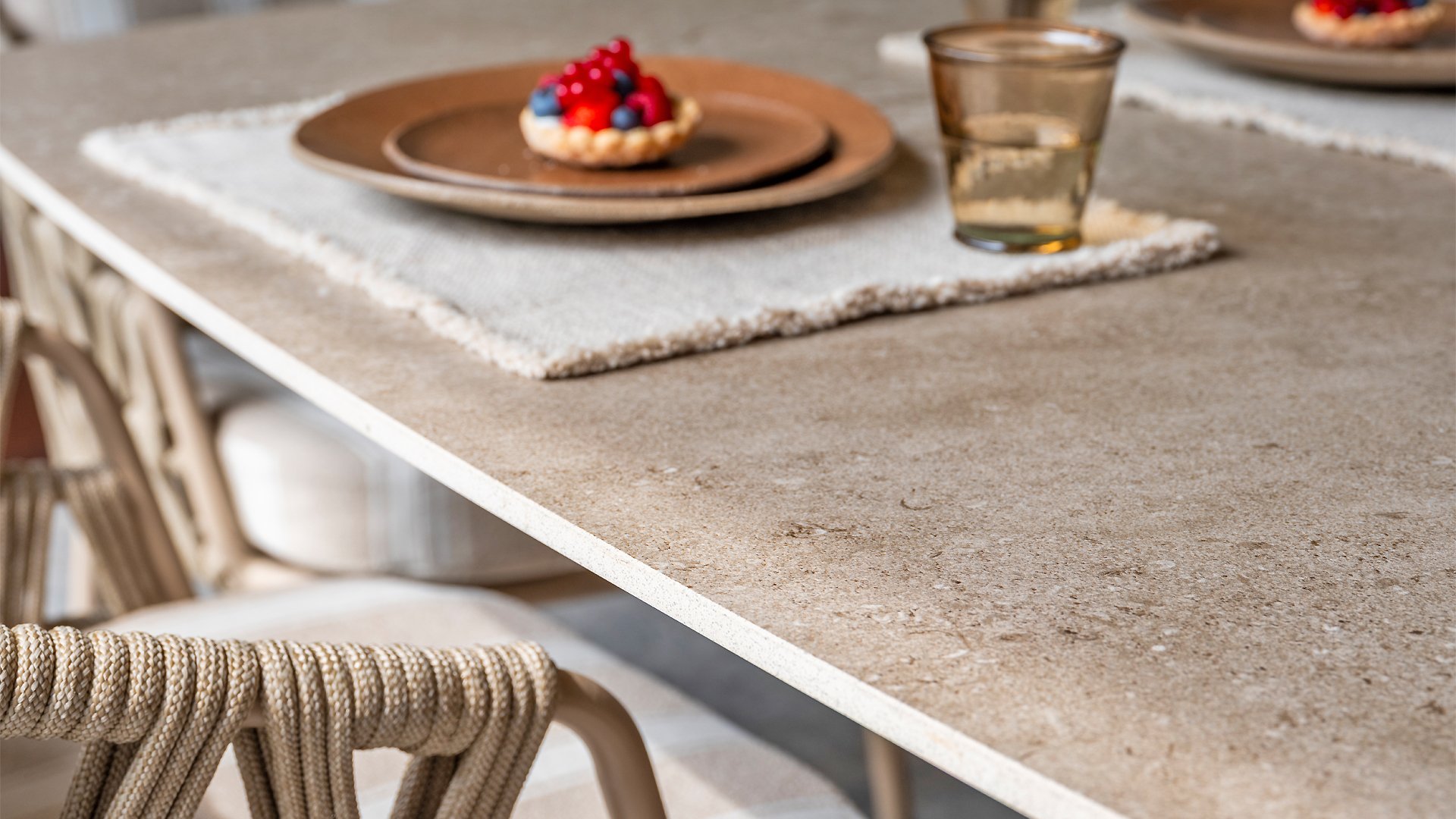 Mortex wordt gemaakt van een mengsel op basis van kalk, cement en fijne minerale poeders. Aan dit mengsel worden pigmenten en harsen toegevoegd om het flexibel, waterdicht en goed hechtend te maken. Het wordt in dunne lagen met de hand aangebracht en daarna geschuurd en afgewerkt met een beschermende sealer of was. Zo ontstaat een naadloos, sterk en stijlvol oppervlak dat geschikt is voor onder andere meubels, vloeren en wanden. Een tuintafel van Mortex is bestand tegen weer en wind. Regen, zonlicht en temperatuurschommelingen hebben weinig invloed op het materiaal, mits de tafel goed is afgewerkt met een beschermlaag. Het is belangrijk om voorzichtig te zijn met zure stoffen, zoals citroensap, azijn of wijn. Wanneer deze te lang op het oppervlak blijven liggen, kunnen ze de beschermlaag aantasten en vlekken veroorzaken.
