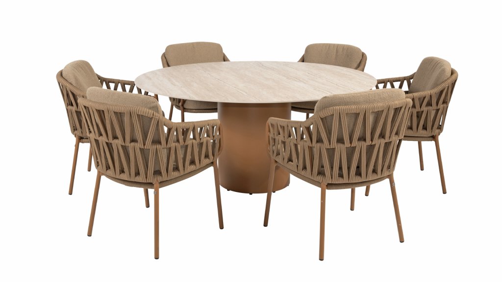 Het stevige frame is vervaardigd uit gepoedercoat aluminium in een warme aardetint, gecombineerd met opvallend dik Rope vlechtwerk. Deze ambachtelijke afwerking geeft de Biarritz serie een robuuste maar toch verfijnde uitstraling. De weerbestendige Olefin kussenhoezen zijn bestand tegen uv-straling en schimmel – ideaal voor jarenlang buitengebruik.