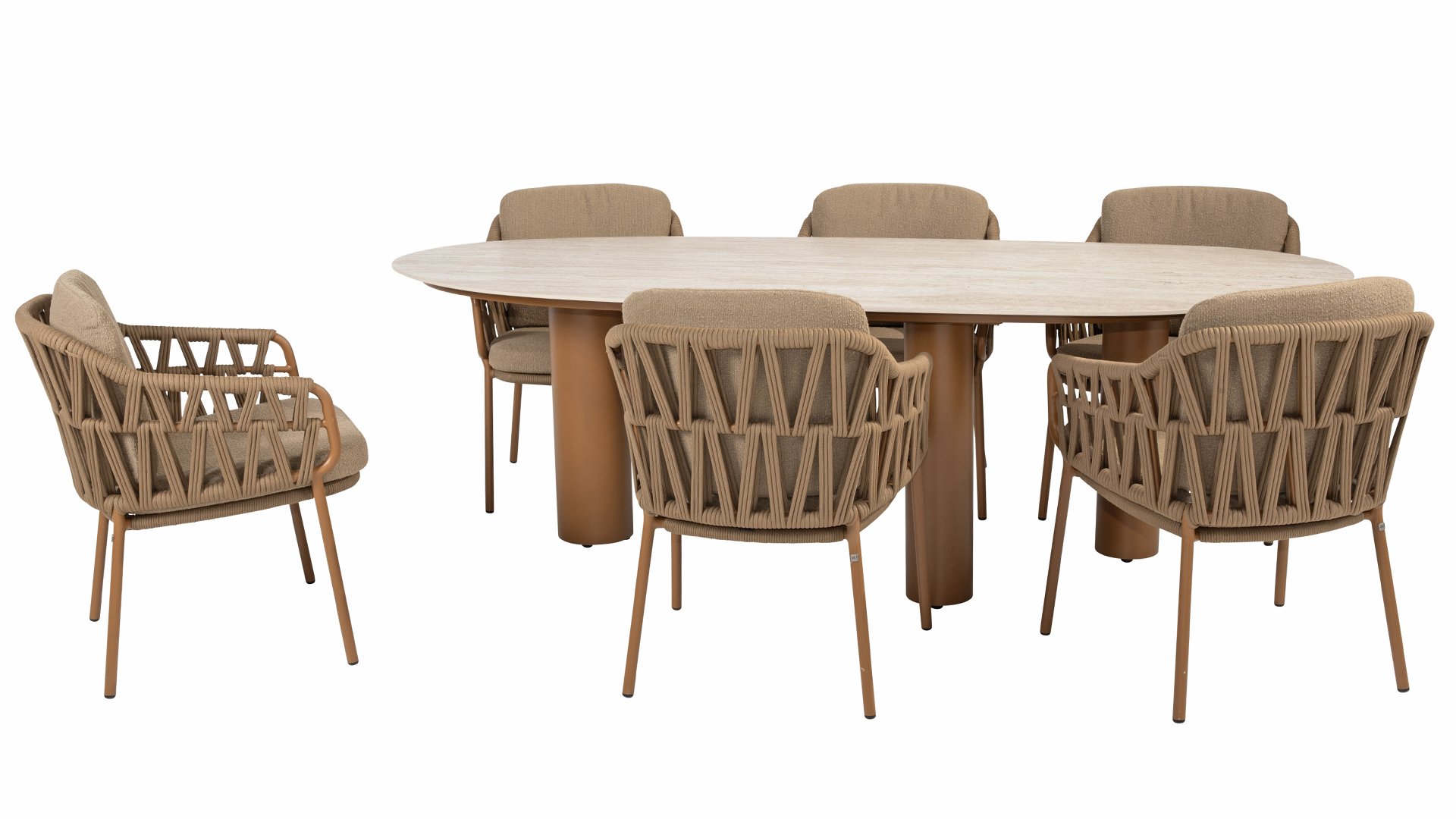 Het stevige frame is vervaardigd uit gepoedercoat aluminium in een warme aardetint, gecombineerd met opvallend dik Rope vlechtwerk. Deze ambachtelijke afwerking geeft de Biarritz serie een robuuste maar toch verfijnde uitstraling. De weerbestendige Olefin kussenhoezen zijn bestand tegen uv-straling en schimmel – ideaal voor jarenlang buitengebruik.