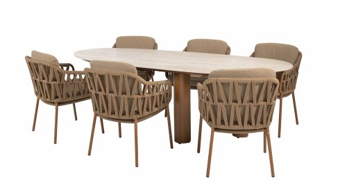 De 4 Seasons Outdoor Biarritz Amber Dining is een perfecte keuze in elke buitenruimte. Met zijn royaal gevlochten Rope details in een diepe amberkleur en de rijk gevulde kussens in een zachte, amber bouclé stof, nodigt deze set uit tot ultiem ontspannen in je tuin of op je terras.
