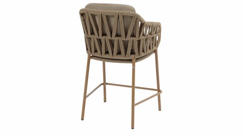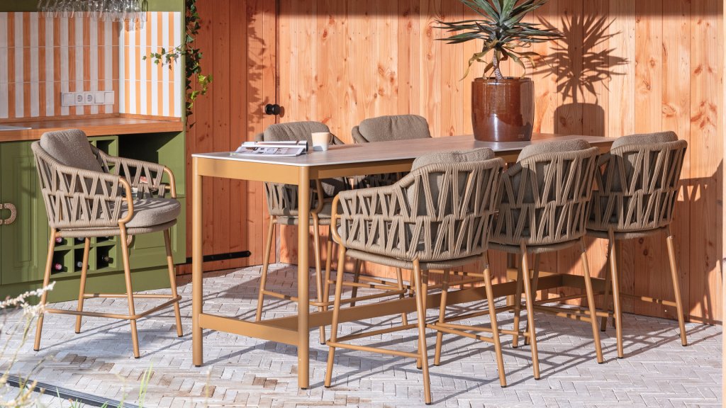 De 4 Seasons Outdoor Biarritz Amber High Dining is een perfecte keuze voor als je iets zoekt wat tussen barstoel- en tuinstoel hoogte in zit. Met zijn royaal gevlochten Rope details in een diepe amberkleur en de rijk gevulde kussens in een zachte, amber bouclé stof, nodigt deze set uit tot ultiem ontspannen in je tuin of op je terras.