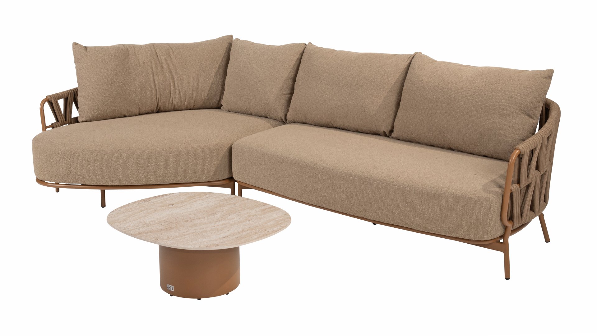 De 4 Seasons Outdoor Biarritz Amber is een elegante en moderne loungecollectie die warmte en comfort uitstraalt. Met zijn royaal gevlochten Rope details in een diepe amberkleur en de rijk gevulde kussens in een zachte, amber bouclé stof, nodigt deze set uit tot ultiem ontspannen in je tuin of op je terras.