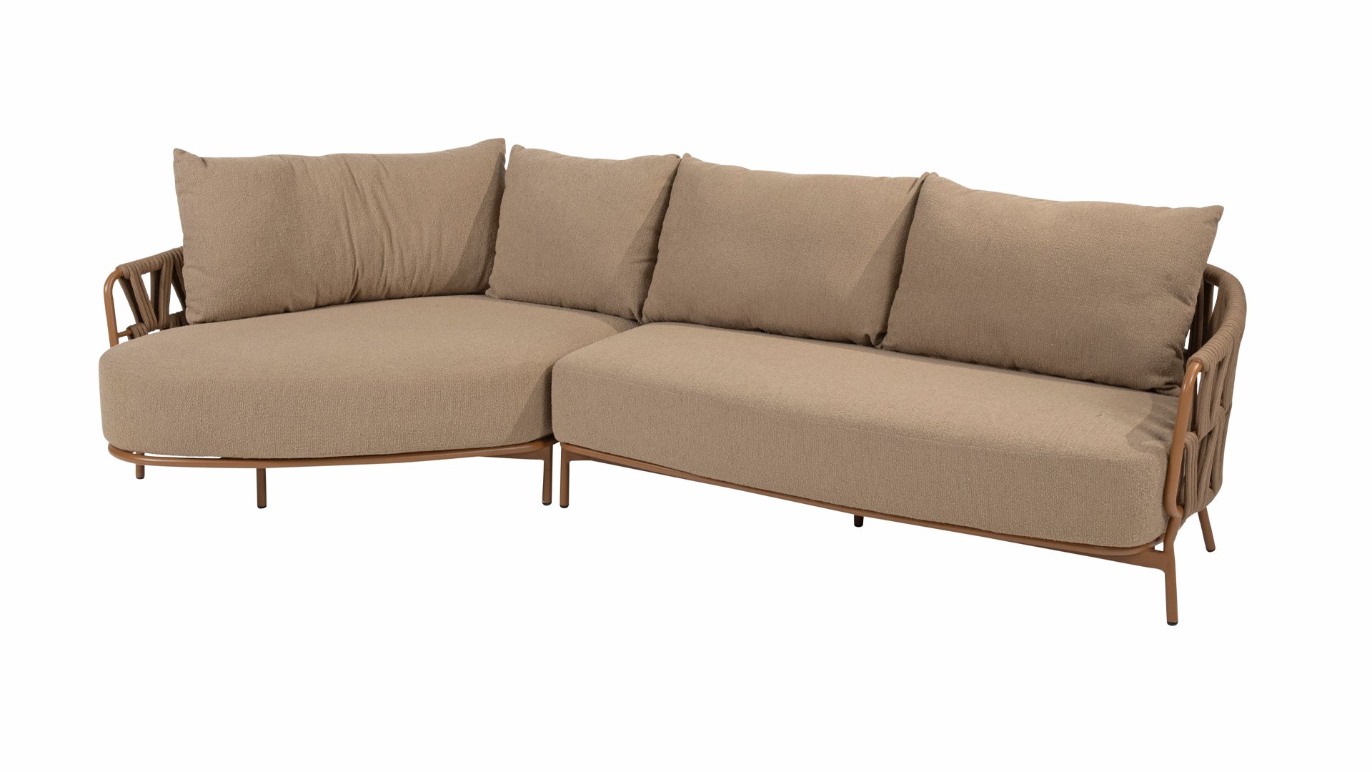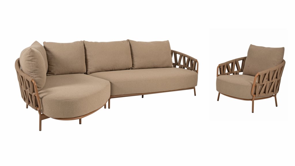 Het stevige frame is vervaardigd uit gepoedercoat aluminium in een warme aardetint, gecombineerd met opvallend dik Rope vlechtwerk. Deze ambachtelijke afwerking geeft de Biarritz serie een robuuste maar toch verfijnde uitstraling. De ruime zittingen, dikke kussens en zachte texturen maken deze lounge tot een luxueuze plek om lange zomerdagen door te brengen.