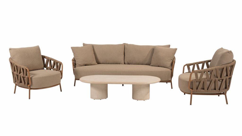 Het stevige frame is vervaardigd uit gepoedercoat aluminium in een warme aardetint, gecombineerd met opvallend dik Rope vlechtwerk. Deze ambachtelijke afwerking geeft de Biarritz serie een robuuste maar toch verfijnde uitstraling. De ruime zittingen, dikke kussens en zachte texturen maken deze lounge tot een luxueuze plek om lange zomerdagen door te brengen.