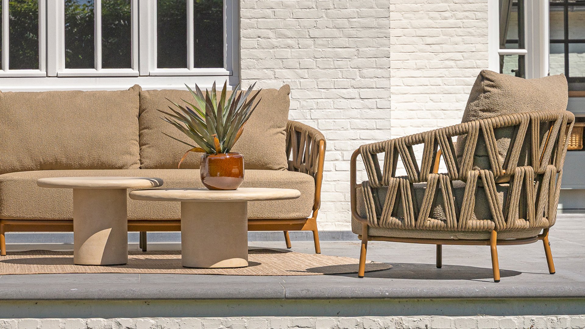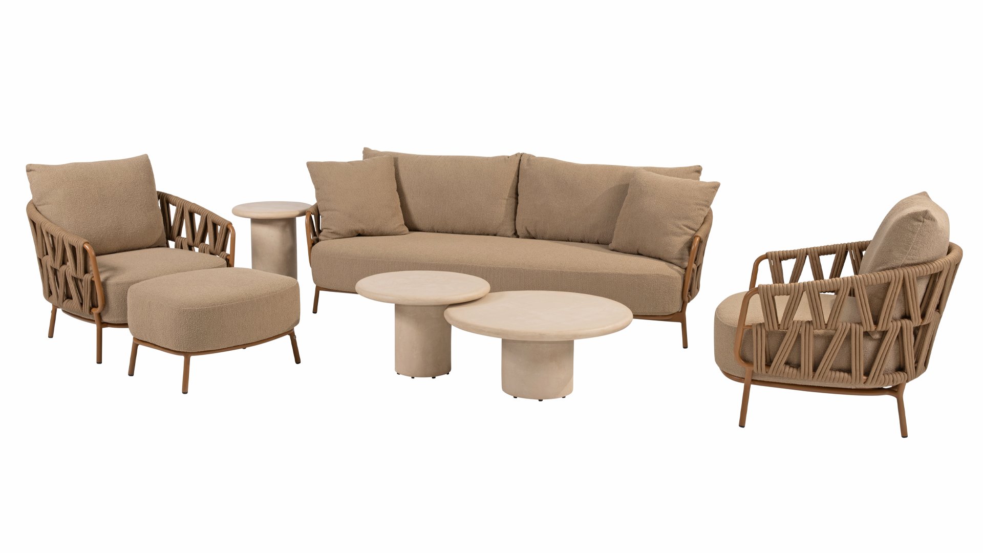 Het stevige frame is vervaardigd uit gepoedercoat aluminium in een warme aardetint, gecombineerd met opvallend dik Rope vlechtwerk. Deze ambachtelijke afwerking geeft de Biarritz serie een robuuste maar toch verfijnde uitstraling. De ruime zittingen, dikke kussens en zachte texturen maken deze lounge tot een luxueuze plek om lange zomerdagen door te brengen.