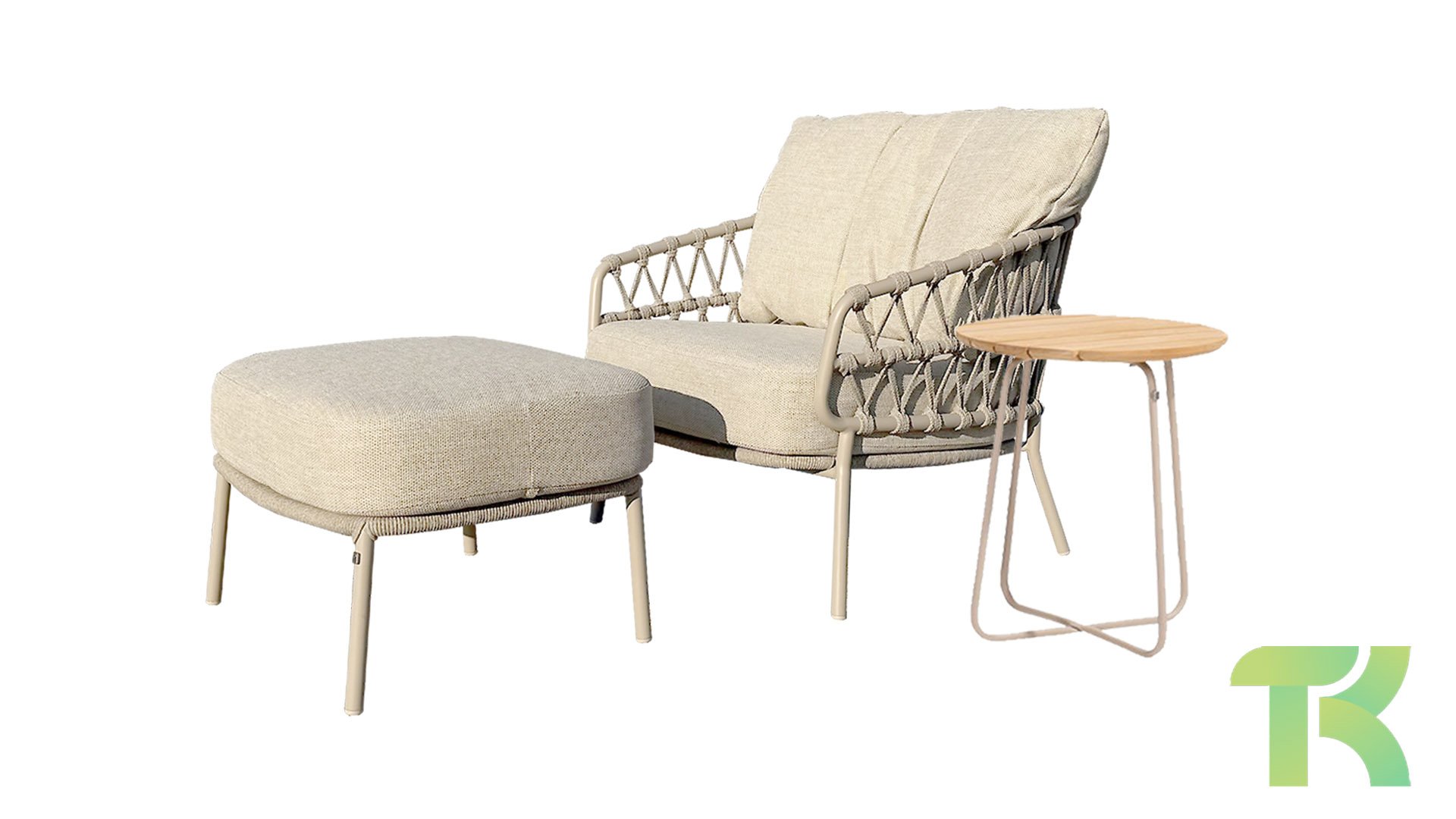 De 4 Seasons Outdoor Calpi serie in een nieuw jasje, Latte. Alleen verkrijgbaar bij Tuinmeubelkorting.nl! Het heeft een eigentijds design en geeft ieder terras de premium en warme looks waar u naar op zoekt bent. De brede rope delen zijn op een originele manier gevlochten en geeft de Calpi een open karakter. De 4Seasons Calpi wordt geleverd met kussens in een all weather stof. Deze stof heeft een water en vuil werende werking, waardoor deze bestand zijn tegen vele weersinvloeden. Het frame is gemaakt van gepoedercoat RVS, waardoor de 4SO Calpi Loungeset zeer geschikt is om het hele jaar door buiten te laten staan.
