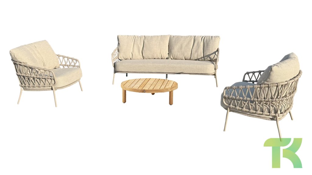 De 4 Seasons Outdoor Calpi serie in een nieuw jasje, Latte. Alleen verkrijgbaar bij Tuinmeubelkorting.nl! Het heeft een eigentijds design en geeft ieder terras de premium en warme looks waar u naar op zoekt bent. De brede rope delen zijn op een originele manier gevlochten en geeft de Calpi een open karakter. De 4Seasons Calpi wordt geleverd met kussens in een all weather stof. Deze stof heeft een water en vuil werende werking, waardoor deze bestand zijn tegen vele weersinvloeden. Het frame is gemaakt van gepoedercoat RVS, waardoor de 4SO Calpi Loungeset zeer geschikt is om het hele jaar door buiten te laten staan.