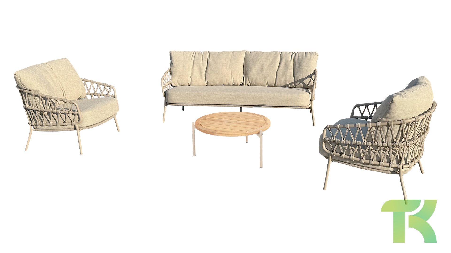 De 4 Seasons Outdoor Calpi serie in een nieuw jasje, Latte. Alleen verkrijgbaar bij Tuinmeubelkorting.nl! Het heeft een eigentijds design en geeft ieder terras de premium en warme looks waar u naar op zoekt bent. De brede rope delen zijn op een originele manier gevlochten en geeft de Calpi een open karakter. De 4Seasons Calpi wordt geleverd met kussens in een all weather stof. Deze stof heeft een water en vuil werende werking, waardoor deze bestand zijn tegen vele weersinvloeden. Het frame is gemaakt van gepoedercoat RVS, waardoor de 4SO Calpi Loungeset zeer geschikt is om het hele jaar door buiten te laten staan.