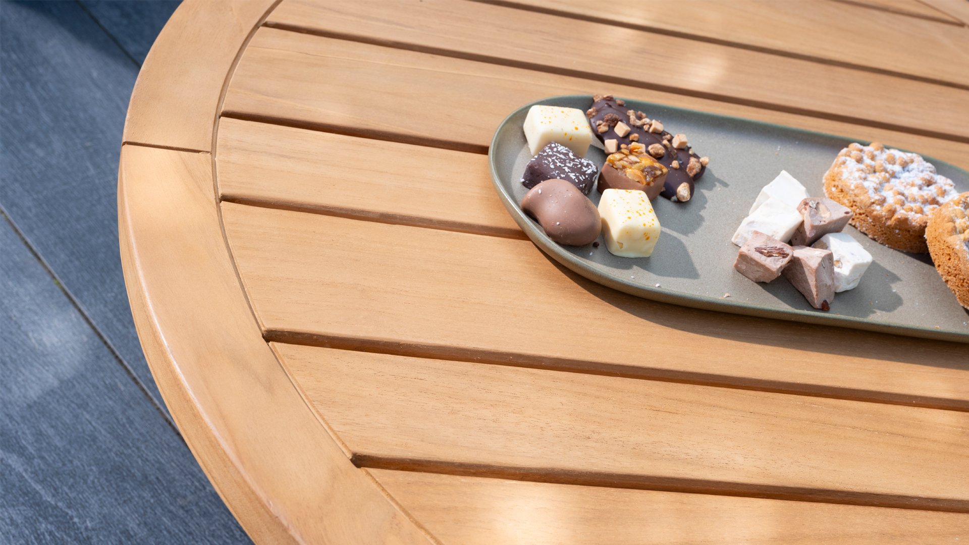 Teakhout is een natuurproduct en bijzonder geschikt voor buitengebruik. Het is bestand tegen ongedierte en schimmels en kan tegen zon, regen en sneeuw. Na verloop van tijd ontwikkelt het teakhout een zilvergrijze patina. Teakhout is een robuust materiaal en vergt weinig onderhoud. Als u de voorkeur geeft aan de originele kleur van het teakhout, kunt u eenvoudig voorkomen dat het hout vergrijst door regelmatig ons verzorgingsproduct te gebruiken. Teakhout kunt u ook reinigen met groene zeep. We geven garantie op alle productie en constructiefouten. De werking van teakhout is hier niet bij inbegrepen. Wanneer je kiest voor teakhout, verwachten we dat je deze eigenschappen waardeert. Haarscheurtjes die kunnen ontstaan, noesten in het teak en na verloop ruwe oppervlakken of onregelmatige verkleuringen zijn geen onderdeel van onze garantie. Deze eigenschappen geven het teakhout een eigen karakter en uitstraling zijn onderdeel van de natuurlijke eigenschappen. Wees voorzichtig met een bloempot of vaas op je teak tuintafel, hierdoor ontstaan er hardnekkige kringen of kleurverschillen. Imperfecties komen vaak voor, deze oneffenheden zijn kenmerkend voor dit product. Deze onregelmatigheden kunnen nooit aanleiding geven tot een claim, garantie of klacht. Dit is een teken van originaliteit!