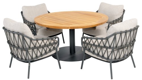 De 4Seasons Saba low dining tafel heeft een gepoedercoat RVS onderstel met een teakhouten tafelblad. Wij adviseren het teakhout te onderhouden met onze onderhoudsmiddelen van 4 Seasons Outdoor om een lange levensduur en een mooie uitstraling te garanderen. De Calpi stoel bestaat uit een RVS onderstel met rope delen welke bestand zijn tegen verschillende weersinvloeden.