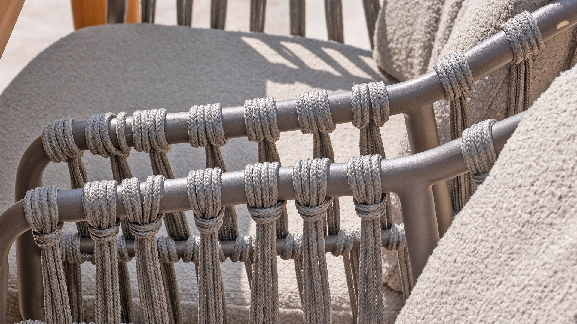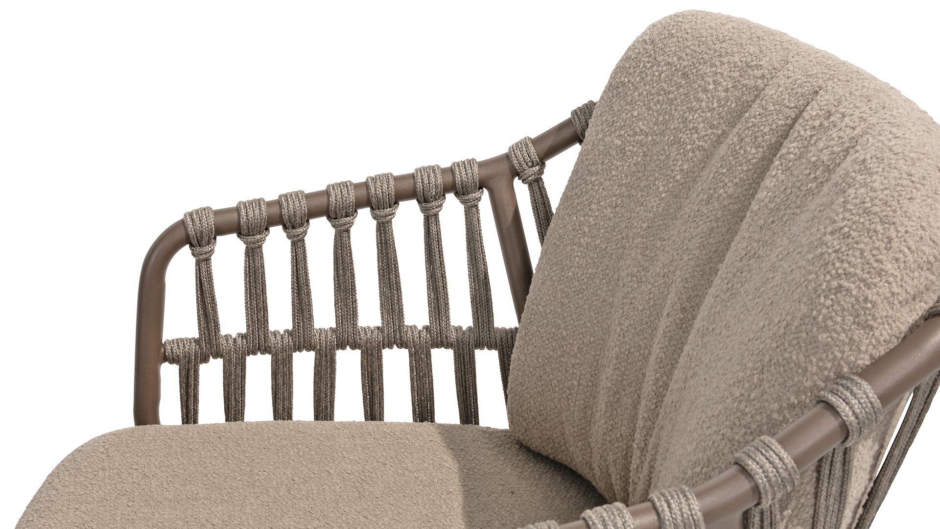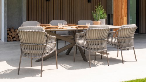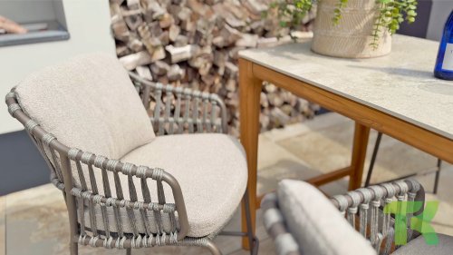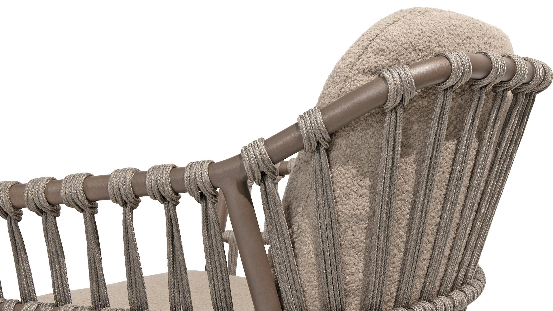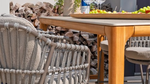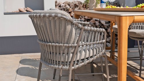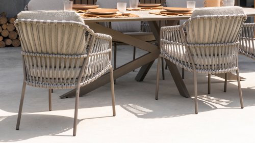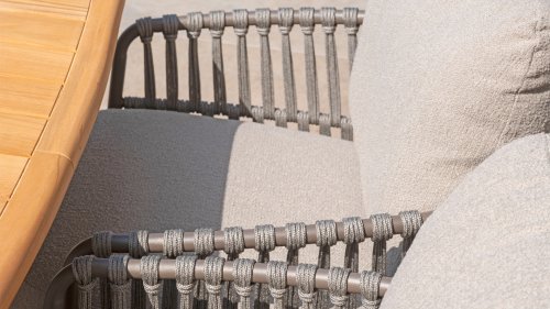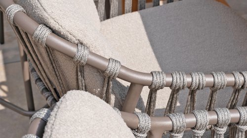 - Stijlvolle afwerking: De combinatie van taupe kussens, grijs rope draad en het terre frame geeft de stoel een moderne, yet tijdloze uitstraling die perfect past bij diverse buiteninrichtingen.