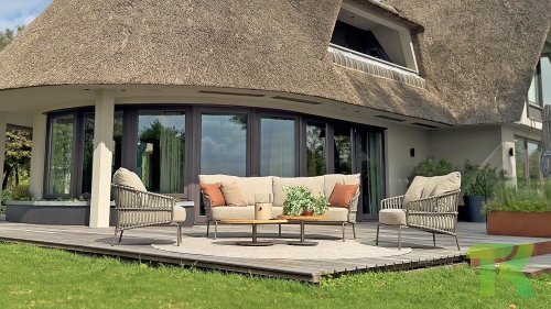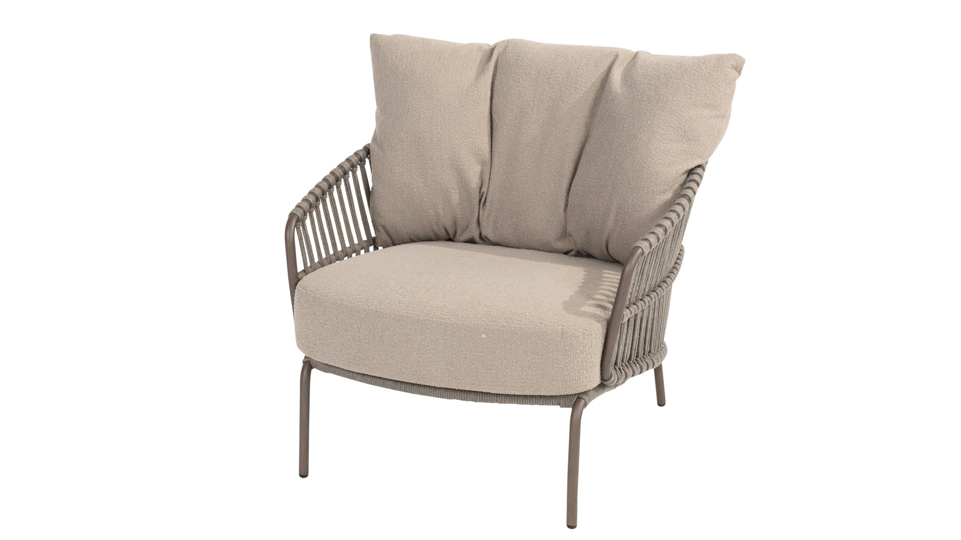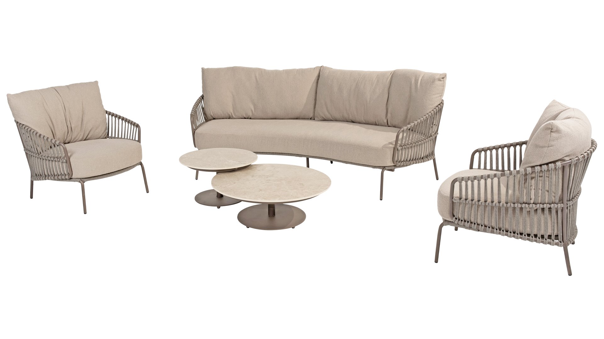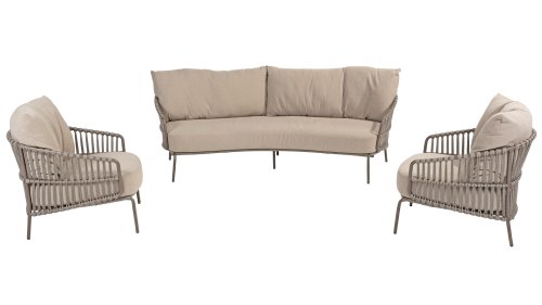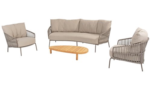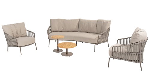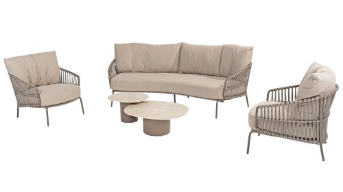 Ervaar het ultieme lounge comfort met de 4 Seasons Capalbio loungeset. Deze lounge is ontworpen om je te laten wegdromen in de extra dikke kussens van zachte bouclé stof. De moderne vormgeving, met zijn elegante rondingen en open Rope patronen, voegt een stijlvolle touch toe aan elke tuin. De Capalbio tuinmeubelen zijn onderdeel van de 2025 collectie van 4 Seasons Outdoor. De Capalbio modellen combineren hoge outdoor kwaliteit met ongeëvenaard comfort. U heeft een ruime keuze uit Capalbio meubelen, variërend van extra lage en hoge dining chairs tot een complete en zeer royale Capalbio loungeset met voetenbank.