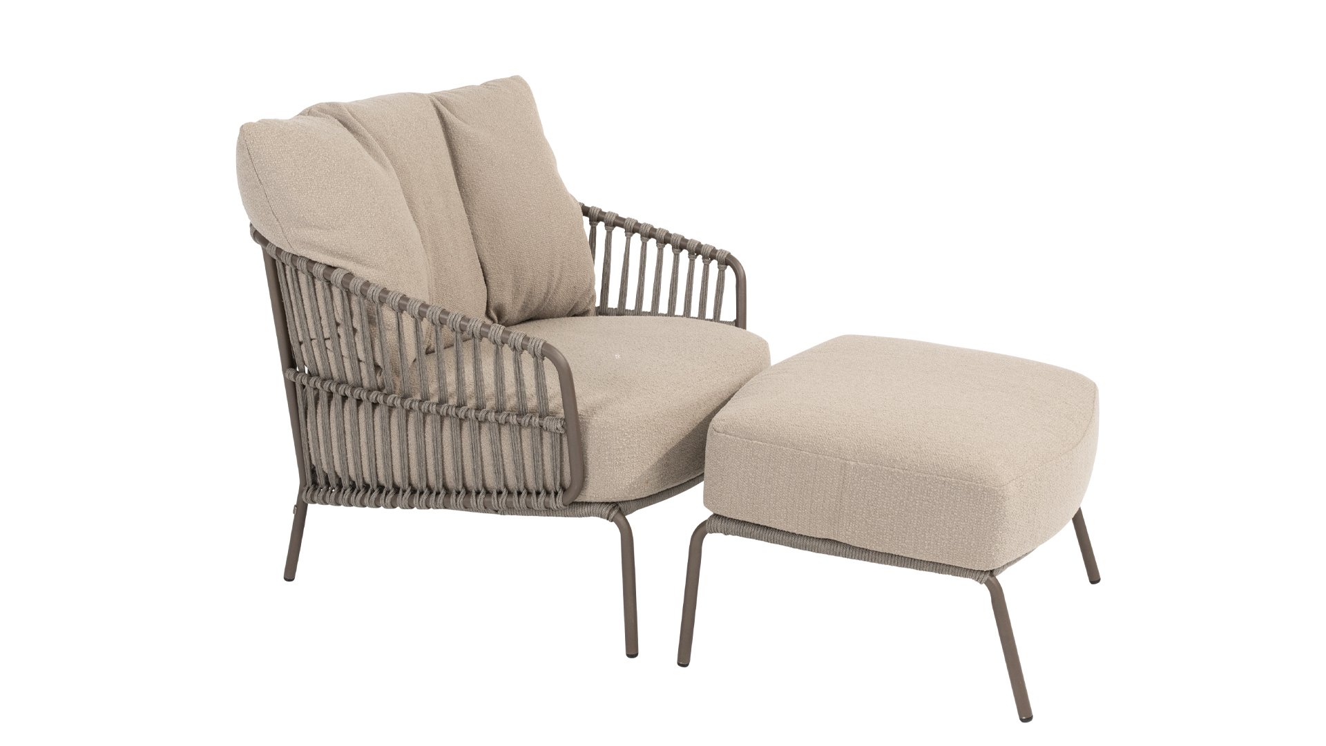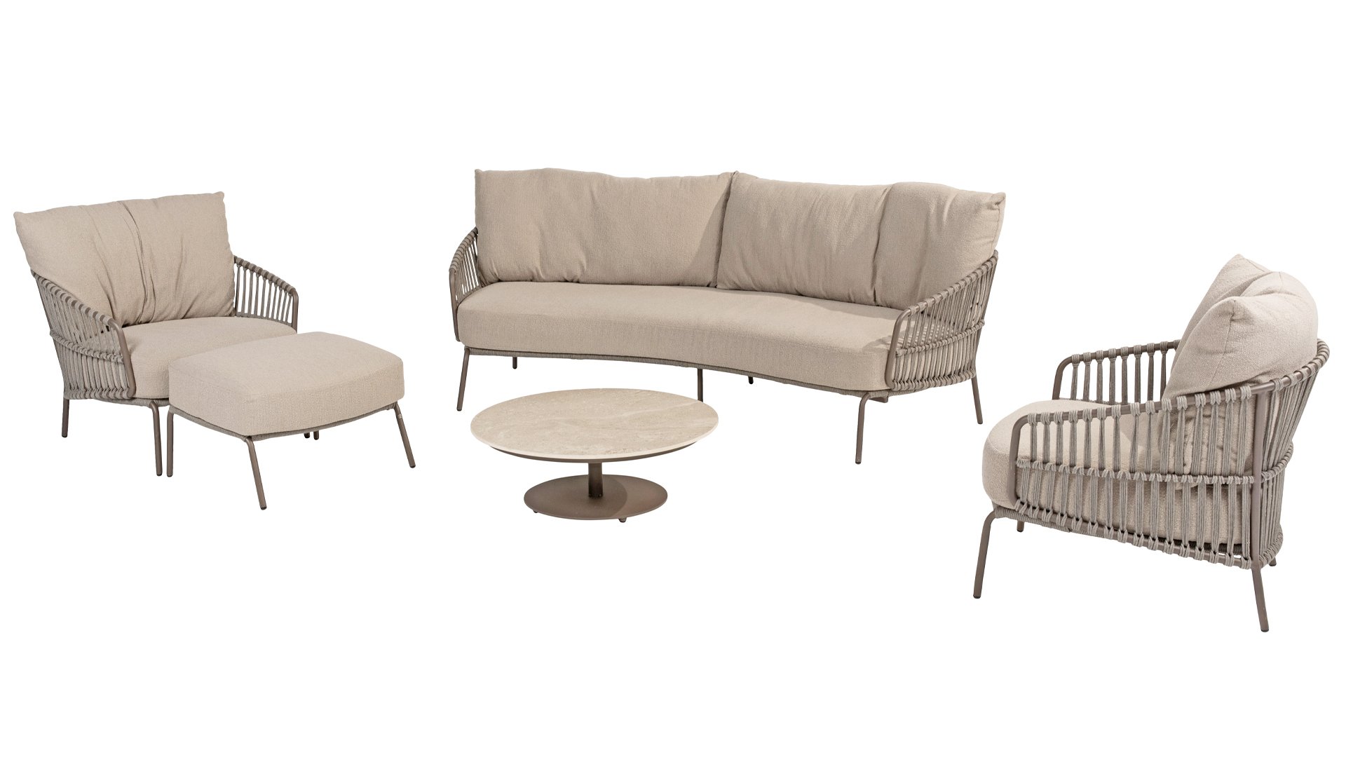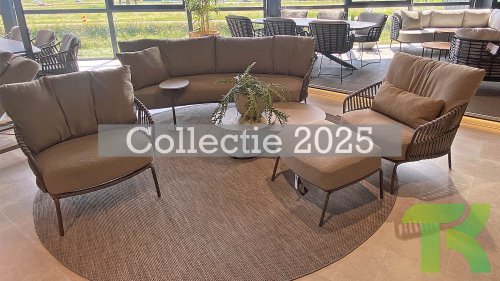 Ervaar het ultieme lounge comfort met de 4 Seasons Capalbio lounge. Deze serie is ontworpen om je te laten wegdromen in de extra dikke kussens van zachte bouclé stof. De moderne vormgeving, met zijn elegante rondingen en open Rope patronen, voegt een stijlvolle touch toe aan elke tuin.