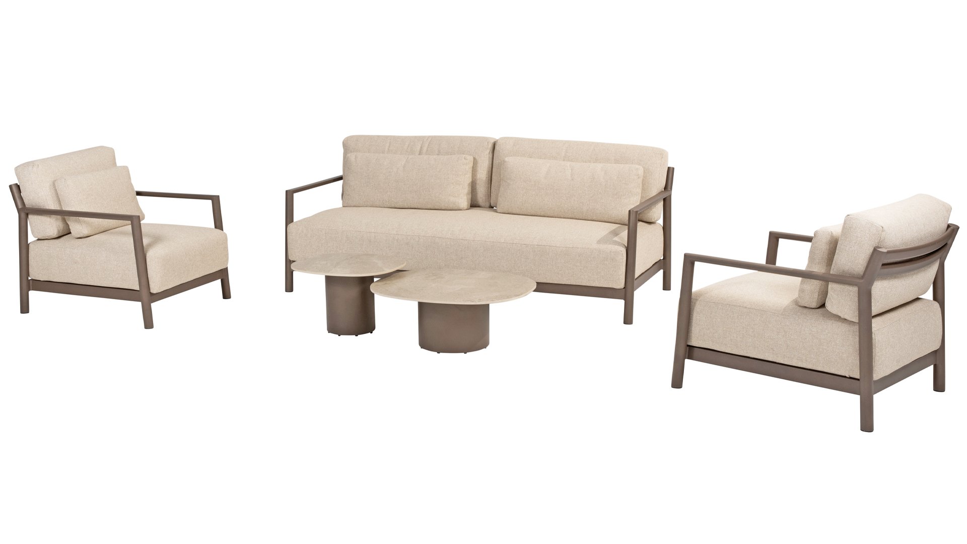 Ervaar ultiem comfort en stijlvolle eenvoud met de Capresi lounge van 4 Seasons Outdoor. Deze prachtige loungeset, uitgevoerd in een elegante Terre kleur, heeft een sobere vormgeving die perfect aansluit bij hedendaagse tuinen. Het volledig aluminium frame is ontworpen met sublieme rondingen, terwijl de dikke lounge kussens voor een heerlijk contrast en optimaal comfort zorgen.