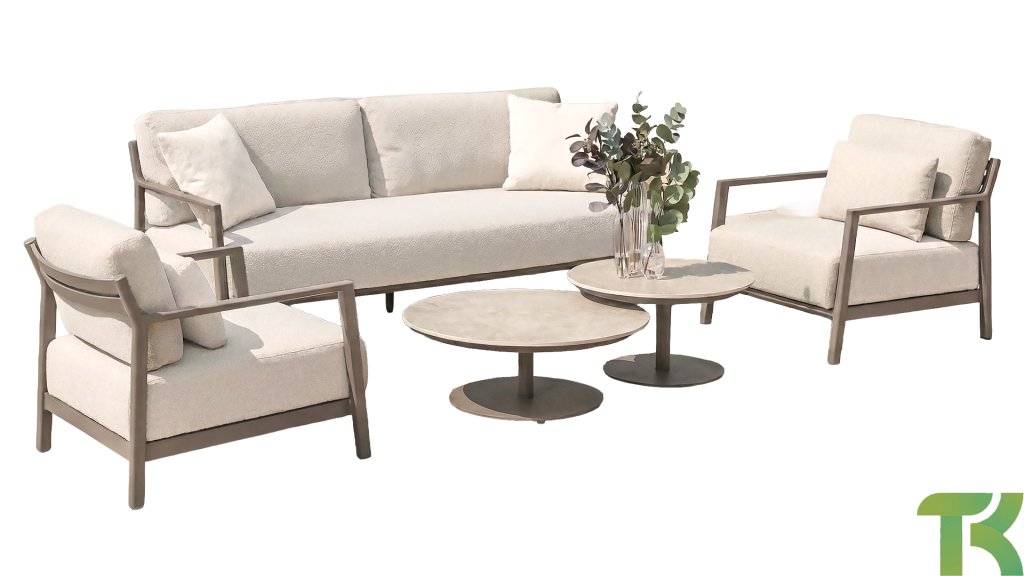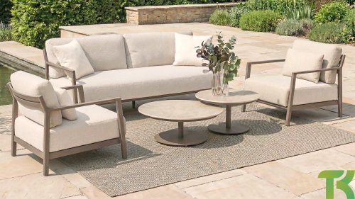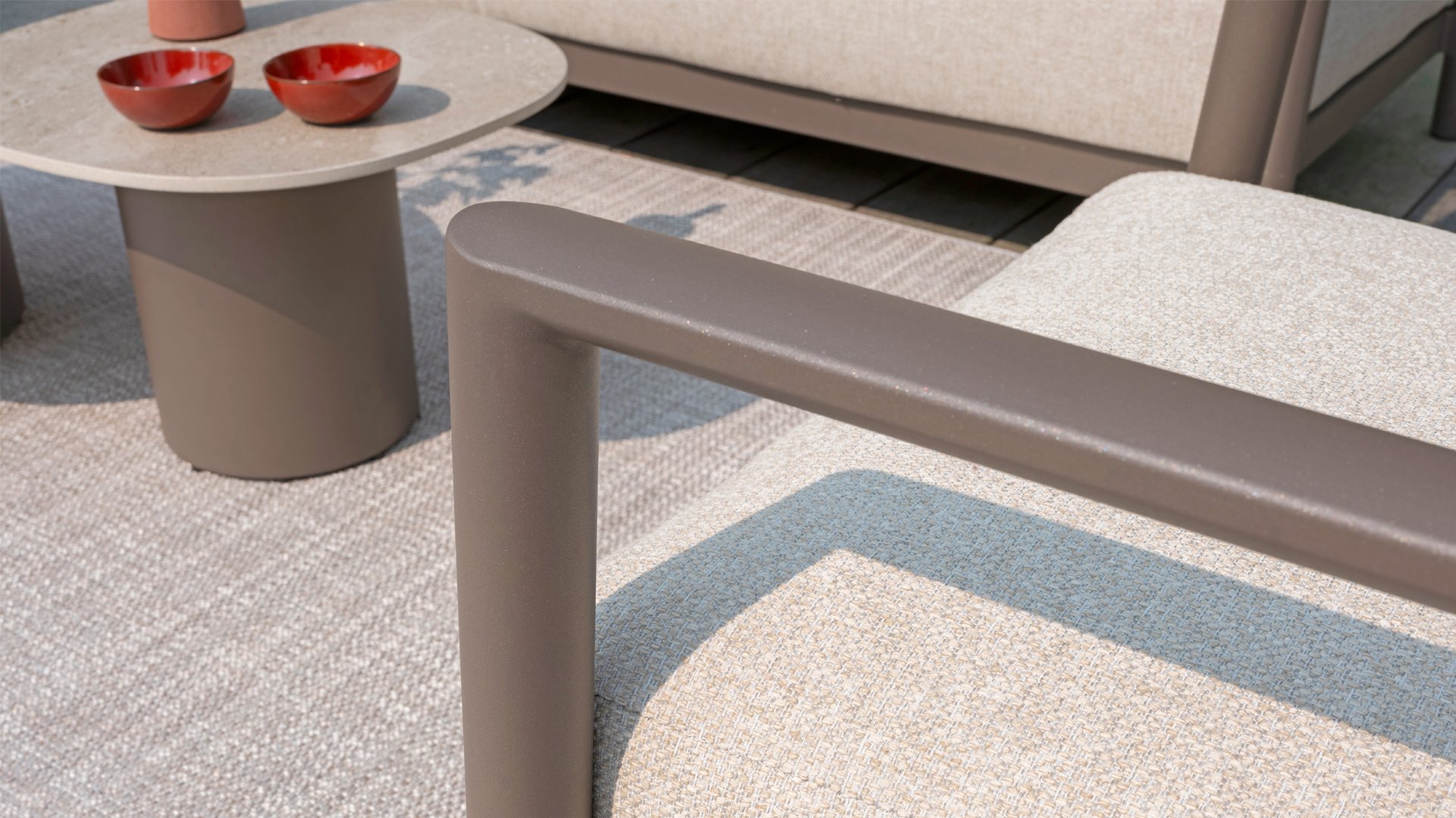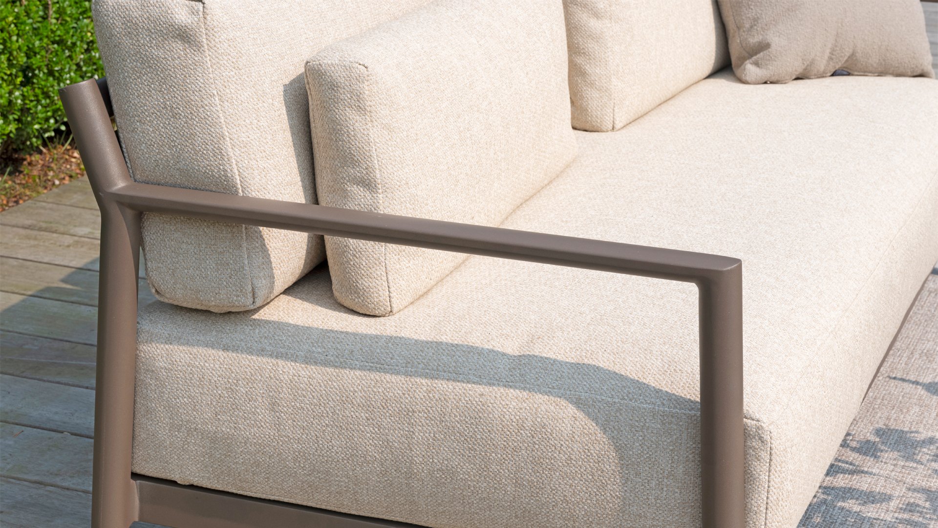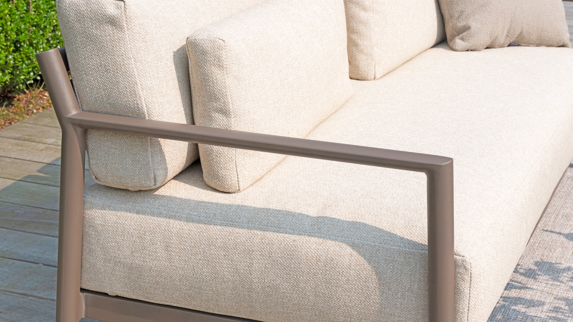 Ervaar ultiem comfort en stijlvolle eenvoud met de Capresi lounge van 4 Seasons Outdoor. Deze prachtige loungeset, uitgevoerd in een elegante Terre kleur, heeft een sobere vormgeving die perfect aansluit bij hedendaagse tuinen. Het volledig aluminium frame is ontworpen met sublieme rondingen, terwijl de dikke lounge kussens voor een heerlijk contrast en optimaal comfort zorgen.
