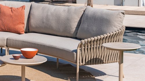De Comino loungebank bestaat uit hoogwaardige outdoormaterialen, wat de bank weerbestendig, duurzaam en onderhoudsvriendelijk maakt.