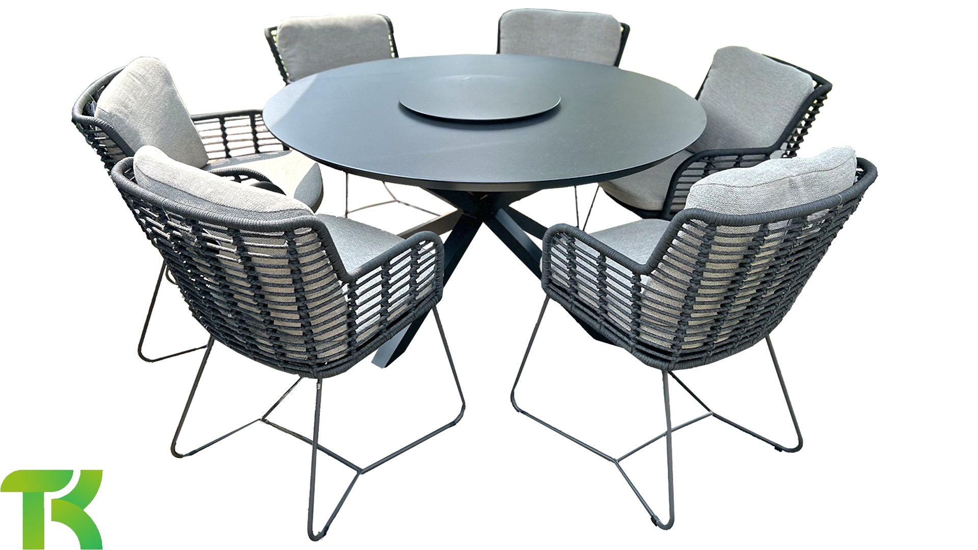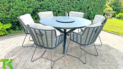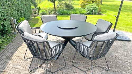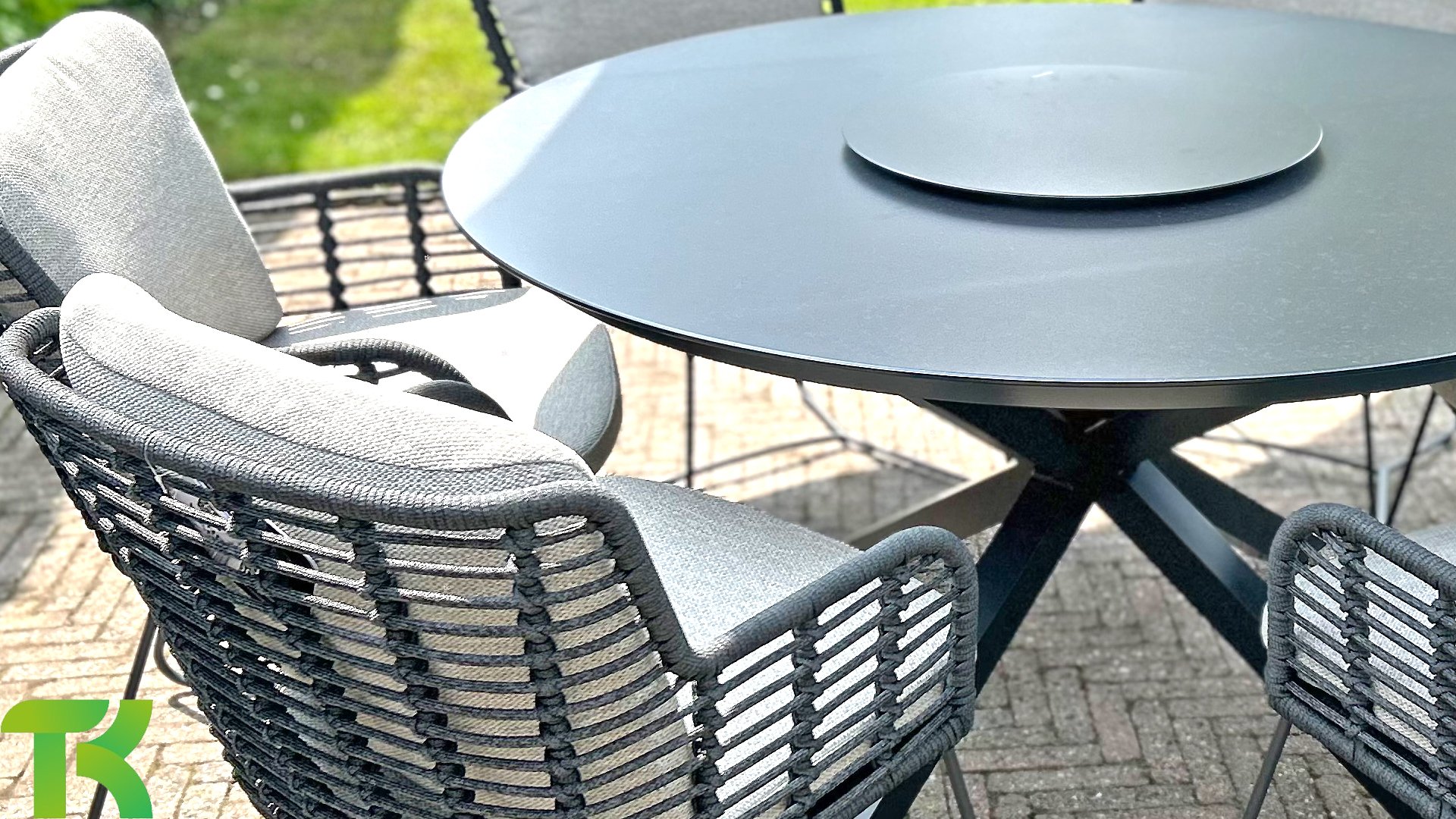 De Atalanta Ø145cm. Vervaardigd van gepoedercoated aluminium in een Antracieten kleur en een 5mm keramiek op glas tafelblad. De tafel die is zo goed als onderhoudsvrij. De tafel wordt ook meegeleverd met een Lazy Susan draaiplateau, wat ideaal is voor wanneer je visite ontvangt en iets wilt doorgeven. Deze prachtige tafel combineert functionaliteit met een stijlvol design, waardoor het de ideale keuze is voor iedereen die van buitenleven houdt.