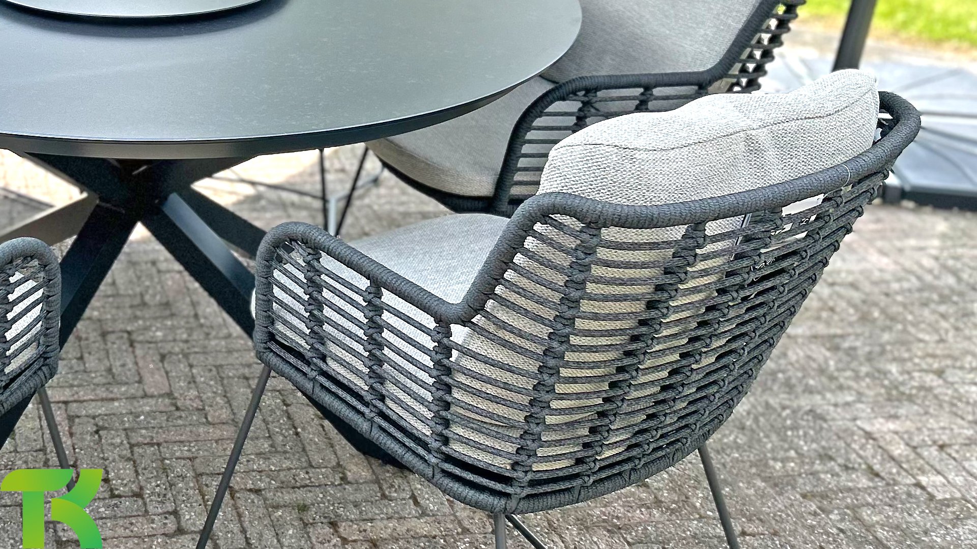 Gemaakt van de beste materialen, gemaakt met passie. Deze prachtige 4Seasons Fabrice dining serie heeft niet alleen flair, maar ook een uitstekend zitcomfort. De stoel is ook verkrijgbaar in de volgende kleuren: Antracite, Latte en Terre. De gebruikte materialen zijn kunststof rope, olefin & aluminium. Kunststof rope bevat een kern wat zorgt voor kleurvastheid en maakt het schimmelbestendig. Olefin maakt de kussens ook kleurvast en waterbestendig, de stof voelt ook comfortabel aan. Het onderstel van de Fabrice is aluminium dat is gepoedercoated om het strakke design af te maken! Ook verkrijgbaar in lounge: 4SO Fabrice Hoek-Loungeset & 4SO Fabrice Loungeset.