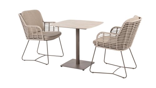 Deze tafel van 75x75 cm heeft een elegant keramieken blad dat zowel stijlvol als praktisch is. Het keramiek is niet alleen duurzaam en gemakkelijk schoon te maken, maar biedt ook een luxe uitstraling. Het onderstel is in een warme, aardse tint genaamd terre, die perfect aansluit bij moderne en rustieke interieurs/tuinen.
