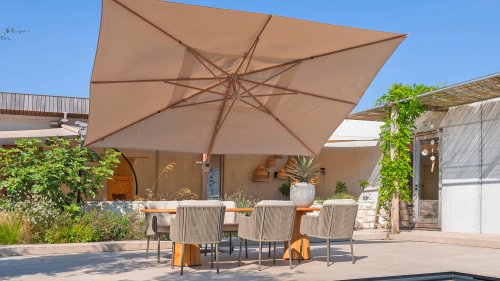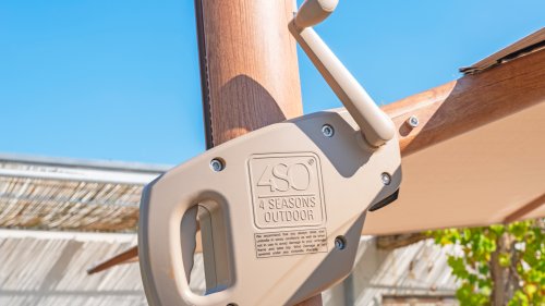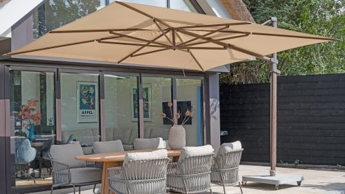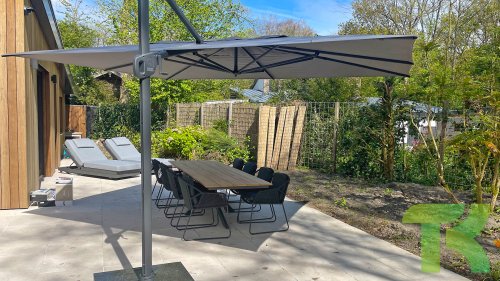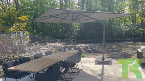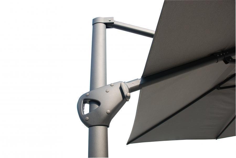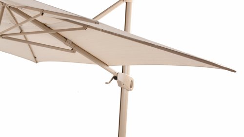 De grootste zweefparasol van 4 Seasons Outdoor, de Hacienda parasol, zorgt voor flink wat schaduw die je eenvoudig op de juiste plaats krijgt. Deze forse parasol heeft een afmeting van 300×400 cm, toch is deze voor iedereen makkelijk te bedienen. Met een simpel handvat laat je de parasol naar het frame toe kantelen zodat de zon niet onder de parasol door schijnt. Met het voetpedaal kun je soepel de parasol 360 graden ronddraaien om helemaal rondom de parasolvoet schaduw te creëren. Draai in enkele seconden de parasol in of uit d.m.v een hendel zodat de parasol snel weer ingeklapt is tot een compact geheel. We adviseren om een beschermhoes te gebruiken wanneer de Hacienda parasol niet in gebruik is.