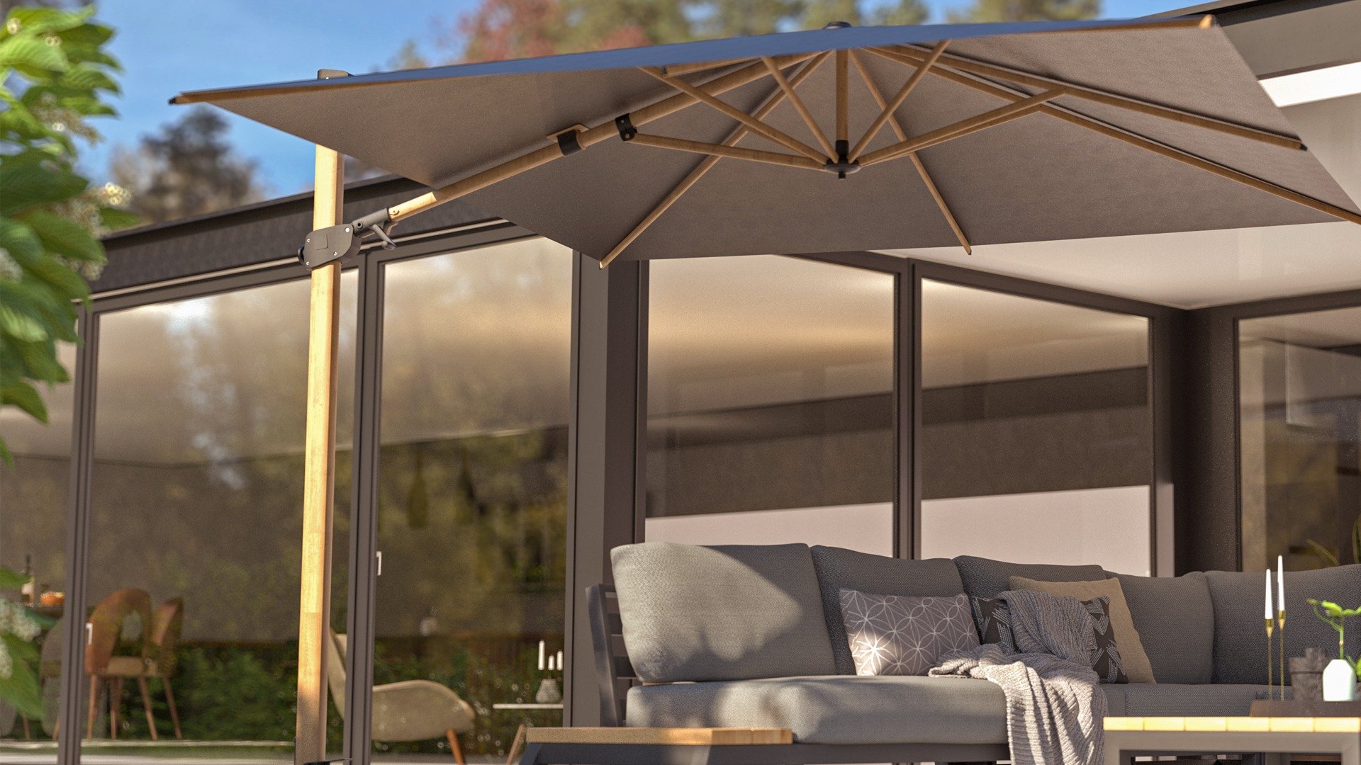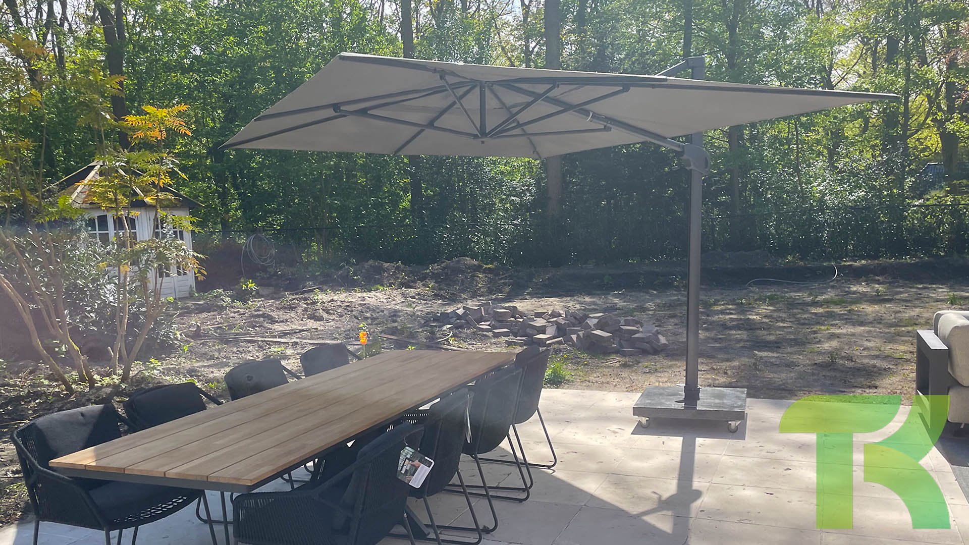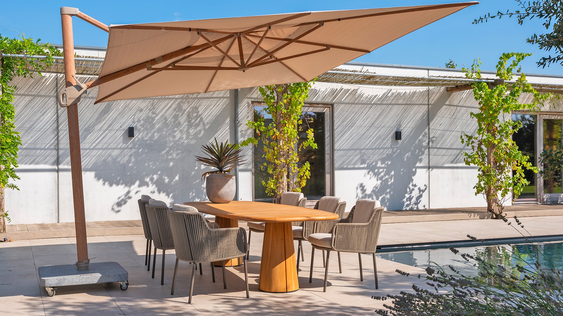 De voet, wielen, verlichting en beschermhoes zijn optioneel (stel zelf uw parasol samen)