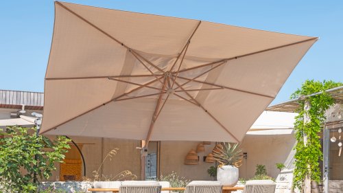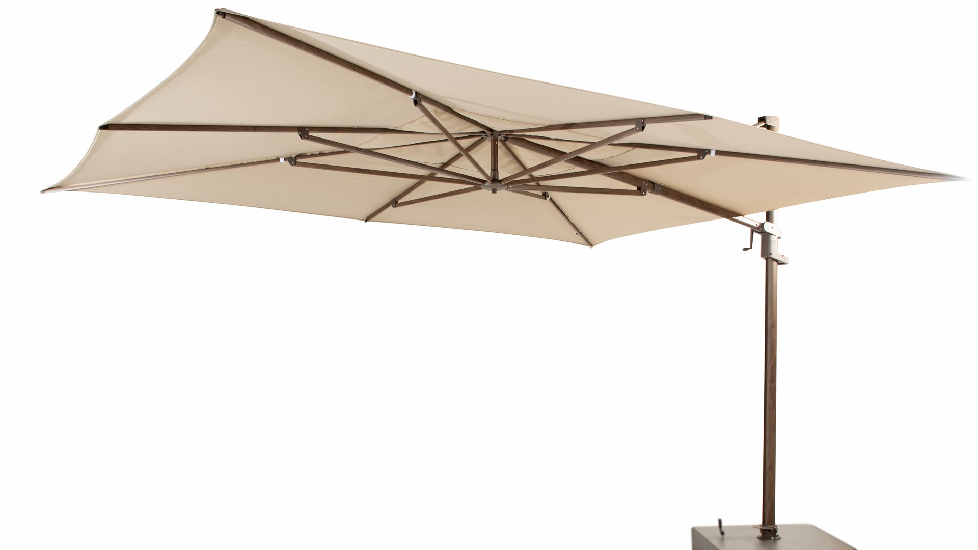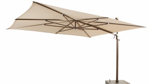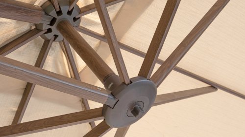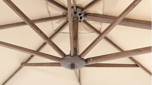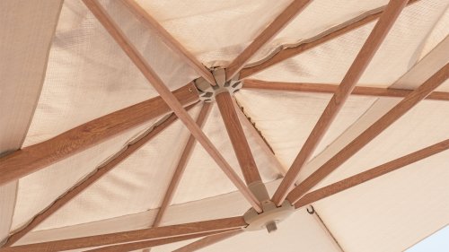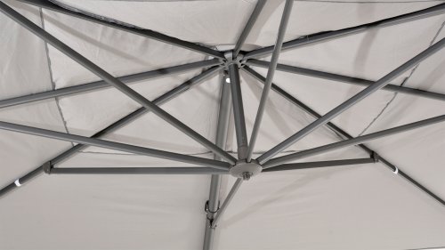 Het hoogwaardige Solefin doek bied bescherming tegen UV stralen en kan tegen een regenbui, ook blijft de stof lang mooi van kleur. De Hacienda parasol heeft een robuust frame van aluminium, verkrijgbaar met een witte, antracieten of wood-look poedercoating. In de nok van de parasol is een uitdraaibaar systeem gezet waar je bijvoorbeeld een parasol verlichting in kunt plaatsen.