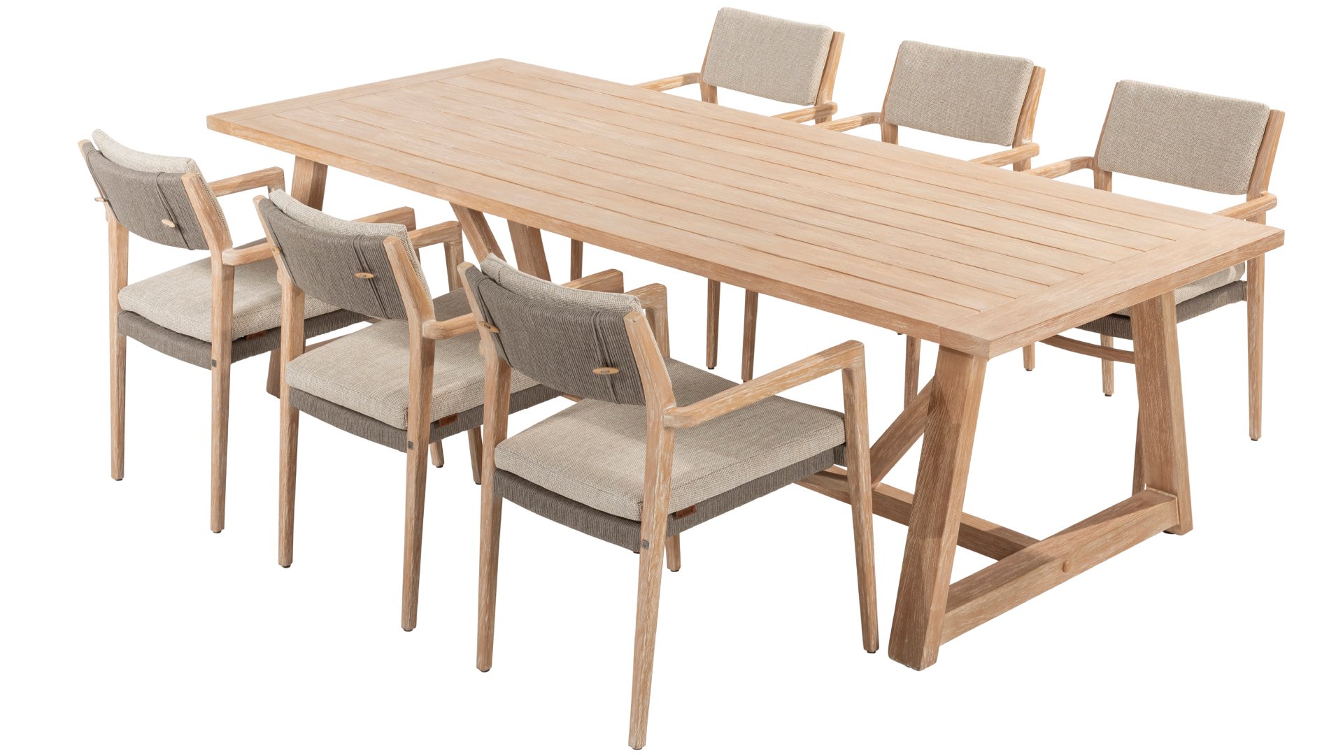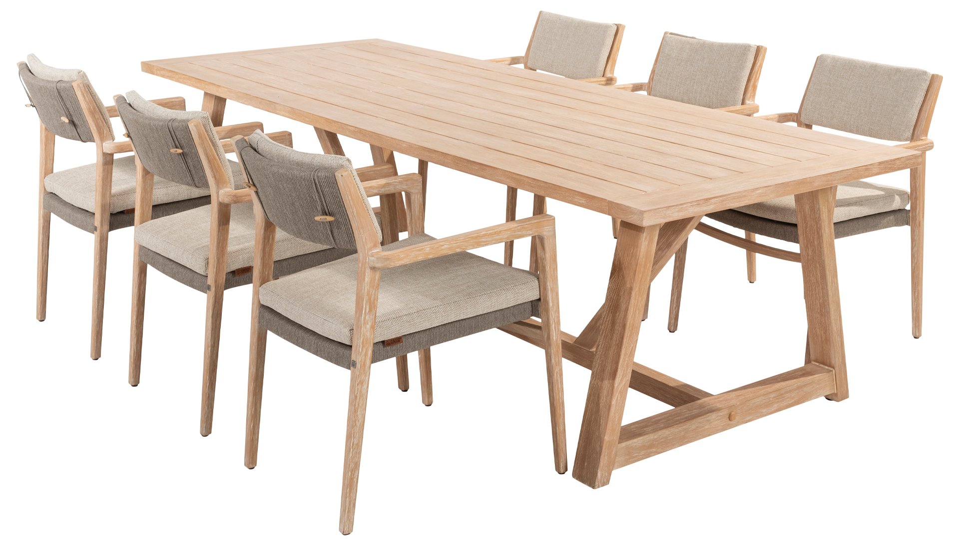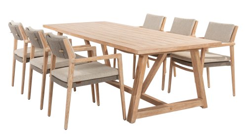 Geniet van tijdloze elegantie en duurzaamheid met de 4 Seasons Outdoor Julia stapelbare dining stoel van brushed teak. Het teak is geborsteld, wat wil zeggen dat het een ruwe, natuurlijke afwerking heeft met lichte highlights in de groeven. Deze afwerking is uniek en geeft dit buitenmeubel een unieke look. Deze stoel wordt geleverd inclusief kussens en heeft een prachtig, hoogwaardig teakhouten frame. Het rope in een taupe kleur maakt het geheel af. Het rugkussen is makkelijk afneembaar door een subtiel touwsysteem. Tevens is van deze serie ook een lounge en low dining verkrijgbaar: 4SO Julia Loungeset & 4SO Julia Low Dining Set.
