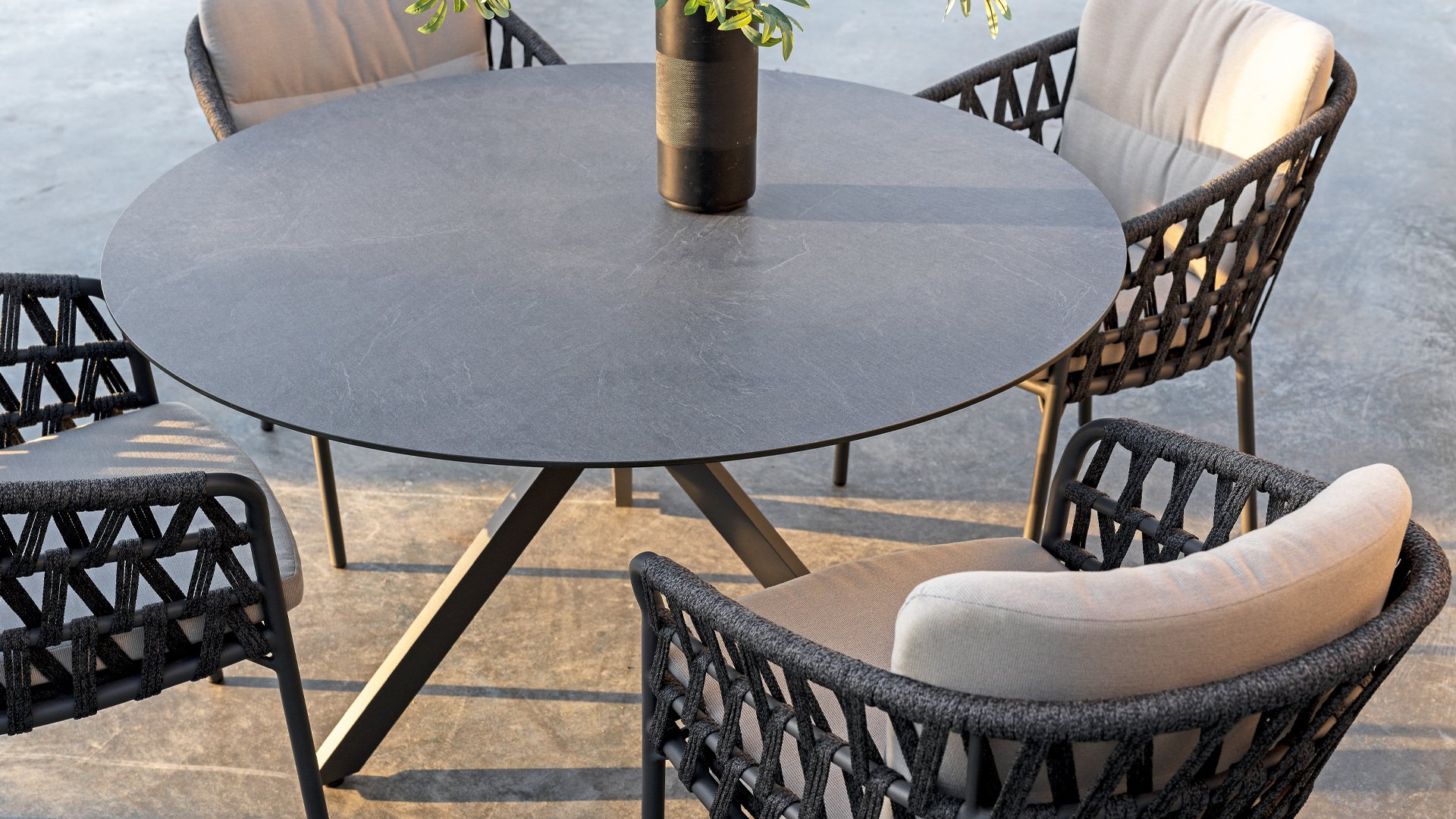 De Locarno tafel van 4 Seasons outdoor is zeer onderhoudsvriendelijk. Het HPL blad in slate antaciet geeft uw terras een moderne en strakke uitstraling. In het donkere antraciet lopen lichte aderen, waardoor het blad natuurlijk oogt. Het kruispoot onderstel geeft de tafel een moderne en elegante uitstraling. Door het onderstel is er ruimte voor 4 of 5 stoelen aan tafel. De tafel is ook verkrijgbaar in Ø160cm formaat: 4 Seasons Outdoor Locarno Tafel Ø160cm Antraciet.