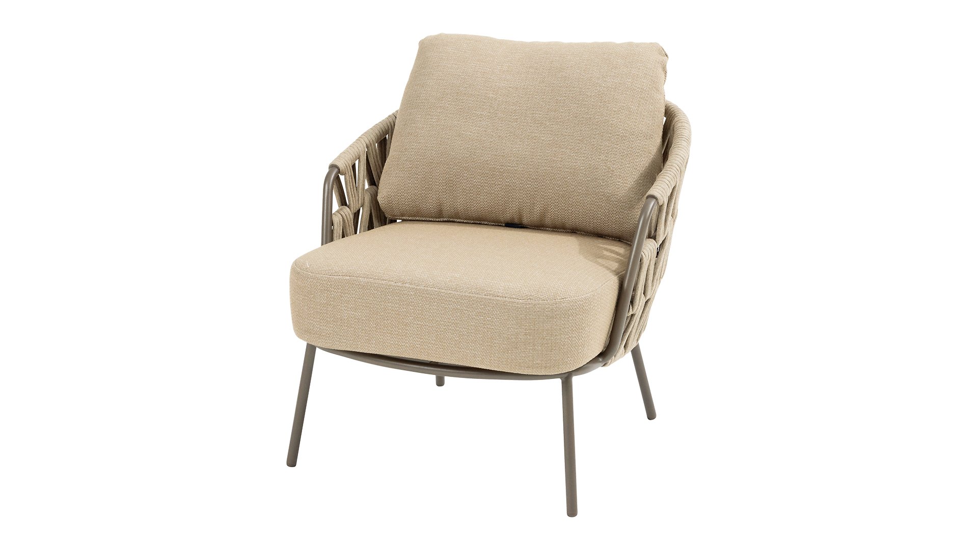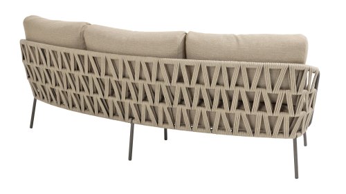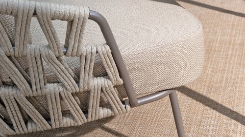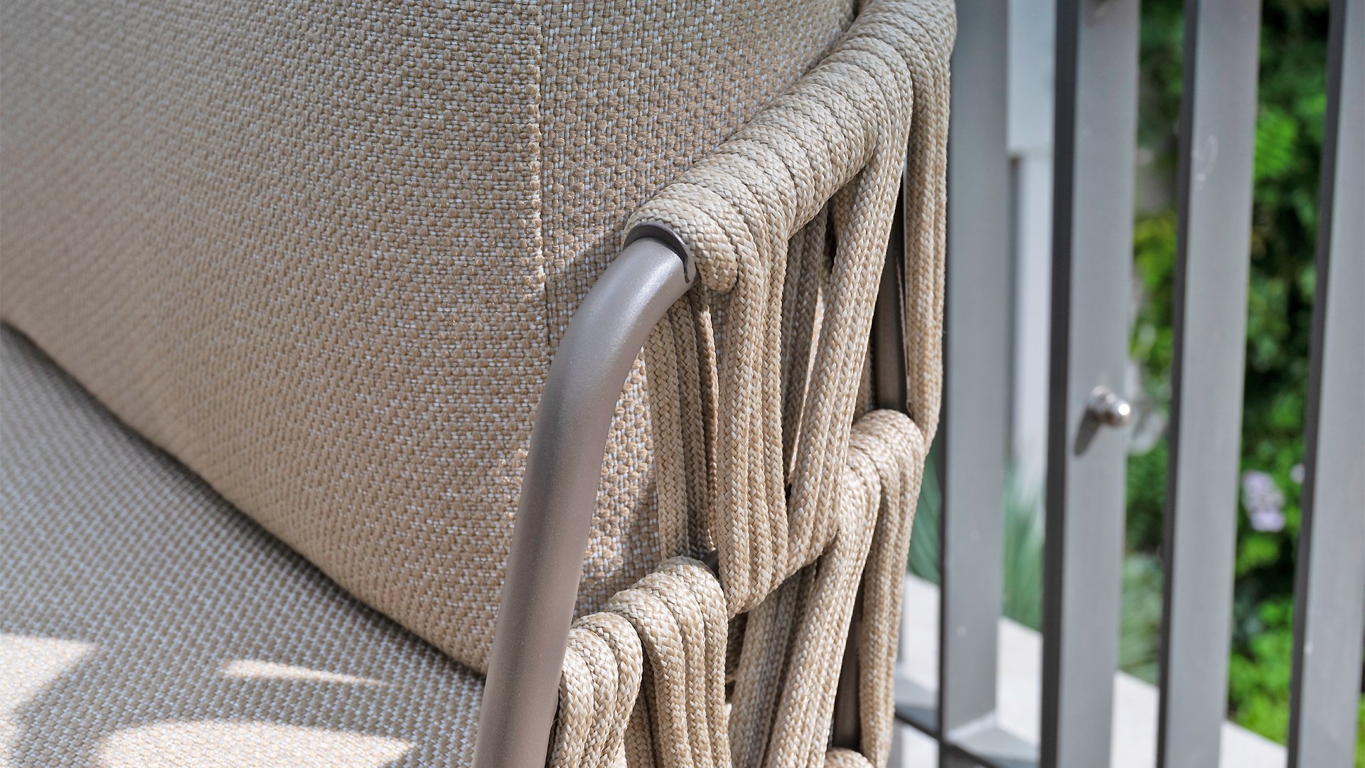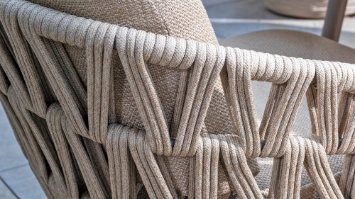 Met een modern gevlochten rope-ontwerp in een natuurlijke taupe tint en royale, strak vormgegeven kussens biedt de Mallorca serie een uitnodigend zitcomfort. De zachte beige bekleding is zowel stijlvol als comfortabel, en de subtiel afgeronde vormen van de stoelen en bank zorgen voor een ontspannen, ergonomische zitervaring.