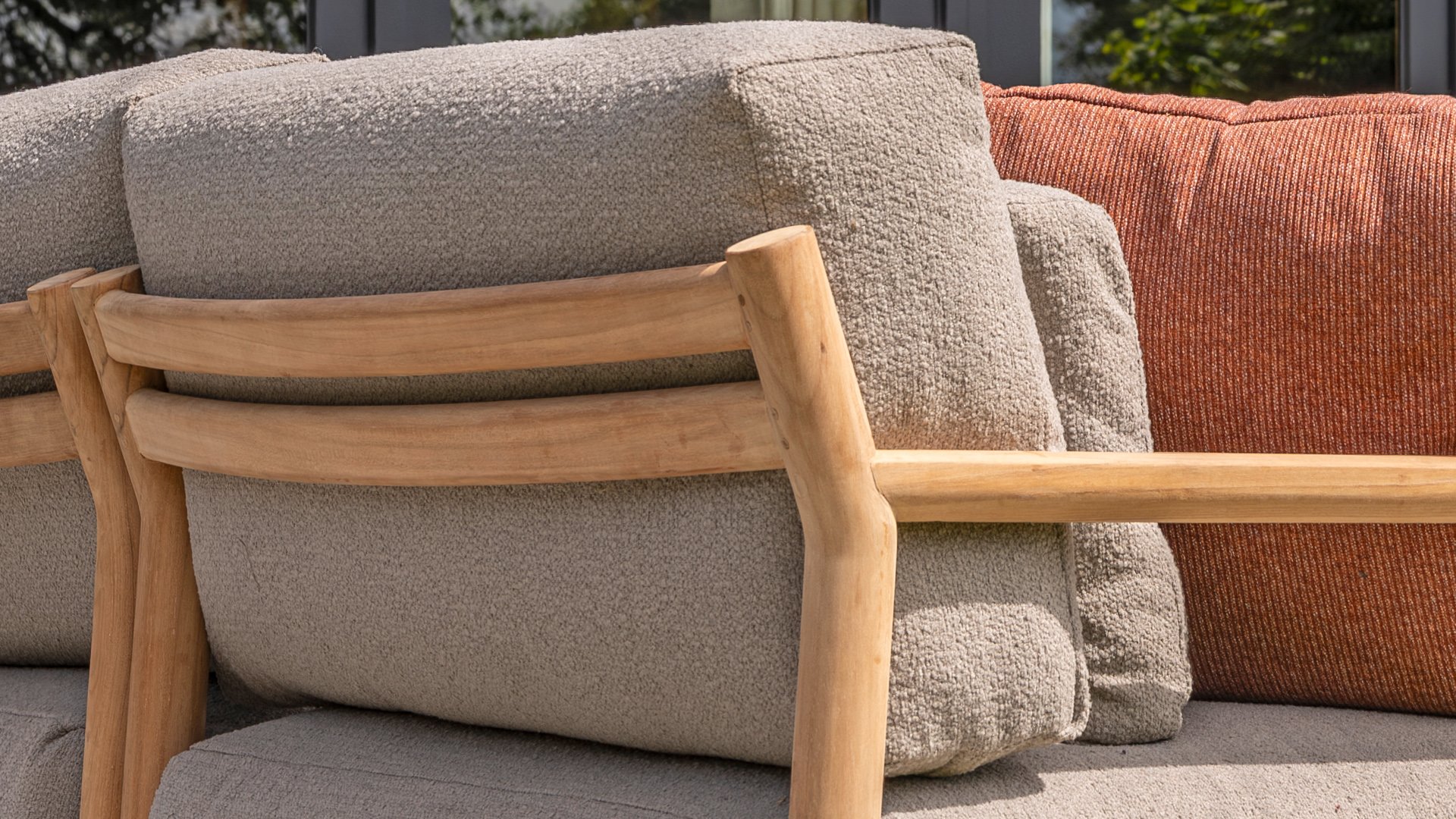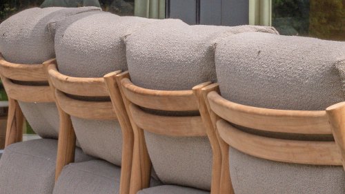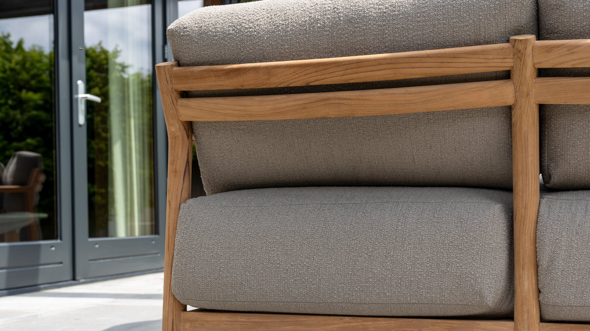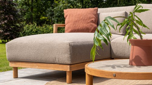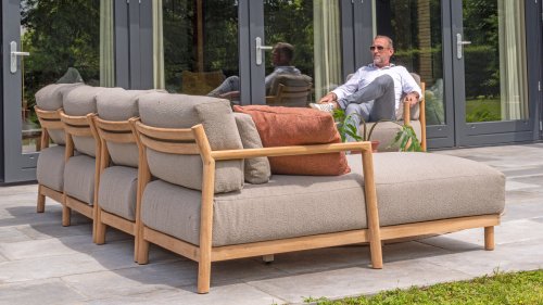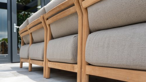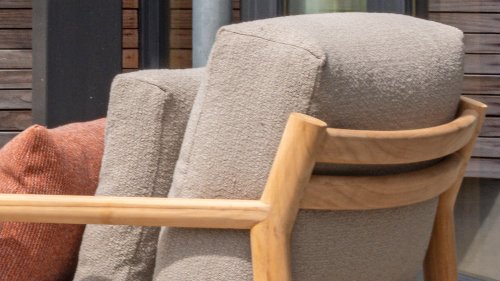 De stijlvolle Marie loungeset onderscheidt zich door het prachtig afgewerkte teakhouten frame en de royale, extra dikke kussens met Bouclé bekleding. De bank biedt dan ook ultiem comfort voor de echte loungeliefhebber. Voor extra ondersteuning wordt de bank geleverd met extra lendenkussens, wat de ergonomie en loungebeleving verder verbetert.