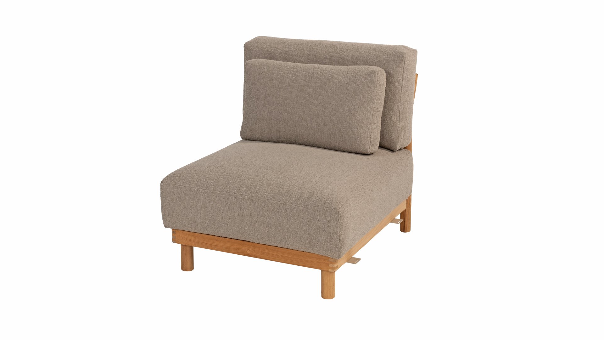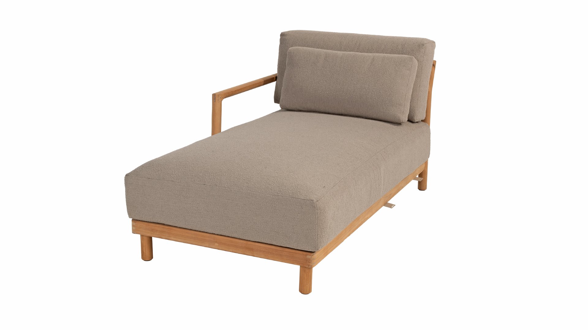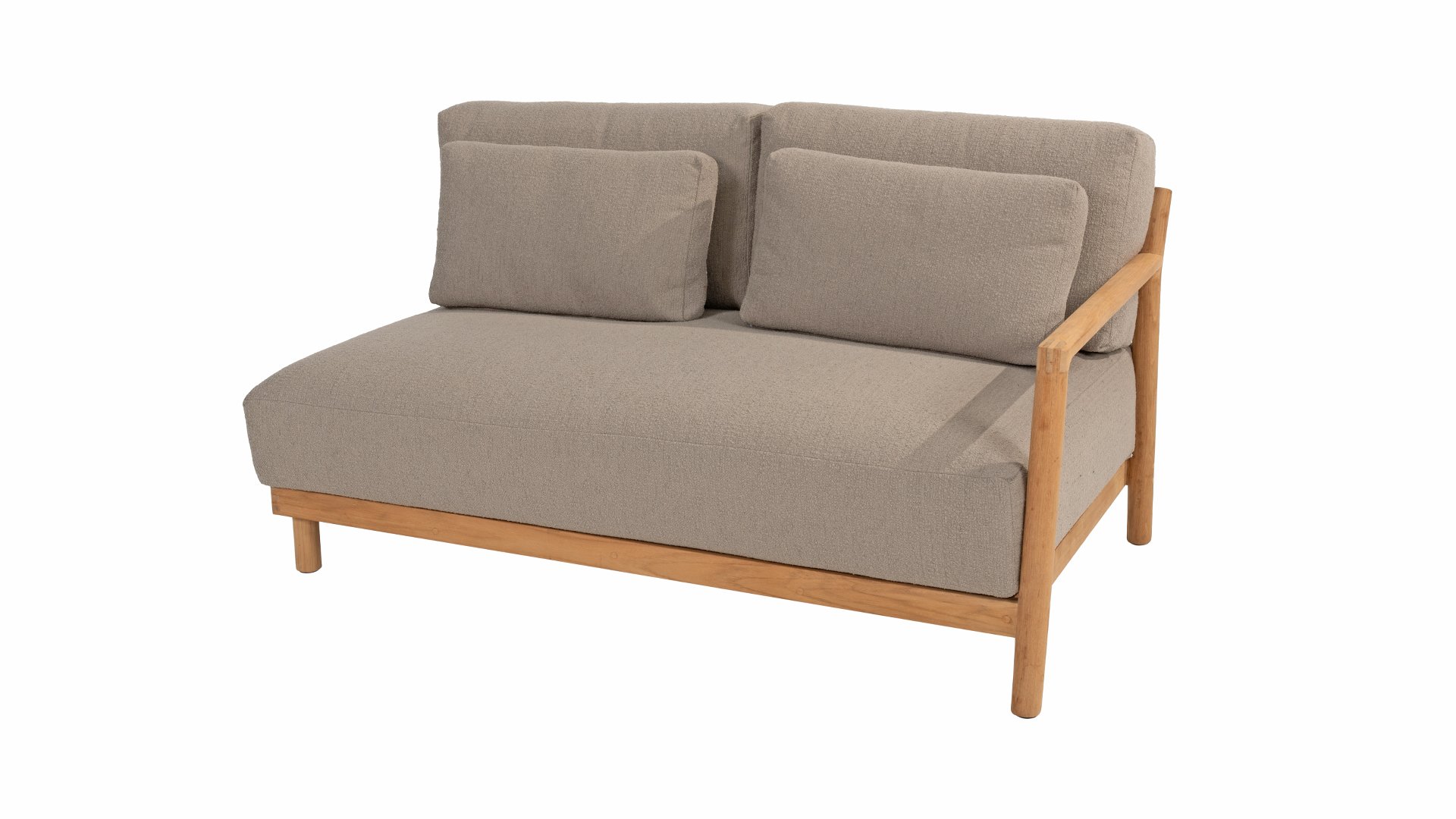 De stijlvolle Marie loungeset onderscheidt zich door het prachtig afgewerkte teakhouten frame en de royale, extra dikke kussens met Bouclé bekleding. De bank biedt dan ook ultiem comfort voor de echte loungeliefhebber. Voor extra ondersteuning wordt de bank geleverd met extra lendenkussens, wat de ergonomie en loungebeleving verder verbetert.