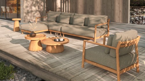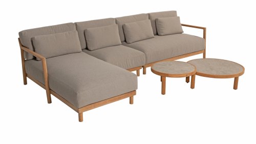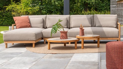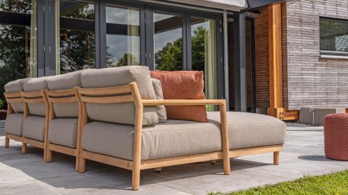 Bewonder Marie. Marie straalt rust, luxe en klasse uit. Het ronde design en het warme teak zorgt ervoor dat de modulaire hoekbank makkelijk te combineren is met diverse andere materialen, maar natuurlijk ook met prachtige Marie loungestoelen. Met zijn geweldige zitcomfort ben je verzekerd van vele zomerse dagen in je tuin.