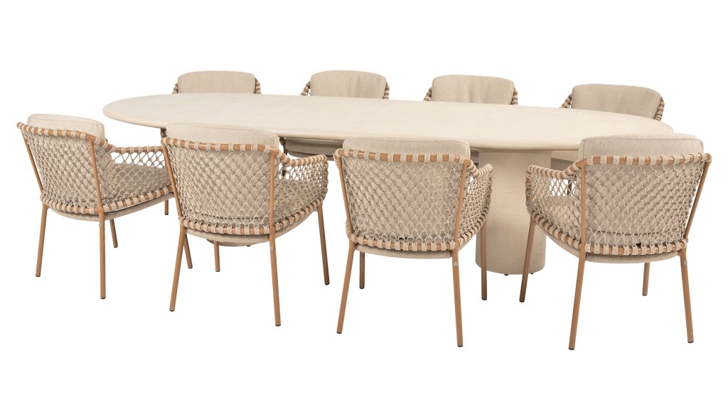 De tafel is verkrijgbaar in diverse formaten, zodat er altijd een Hampton is die bij jouw buitenleven past. Kies voor de ronde Ø160cm variant voor een gezellige setting met één elegante middenpoot, of ga voor de royale ovale uitvoering van 240cm of 300cm, beide voorzien van twee strakke, verticale poten die zorgen voor stabiliteit en een krachtig lijnenspel. Voor wie graag wat lager dineert, is er ook een low dining-versie van Ø160cm, ideaal voor ontspannen momenten in lounge-stijl.