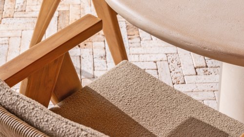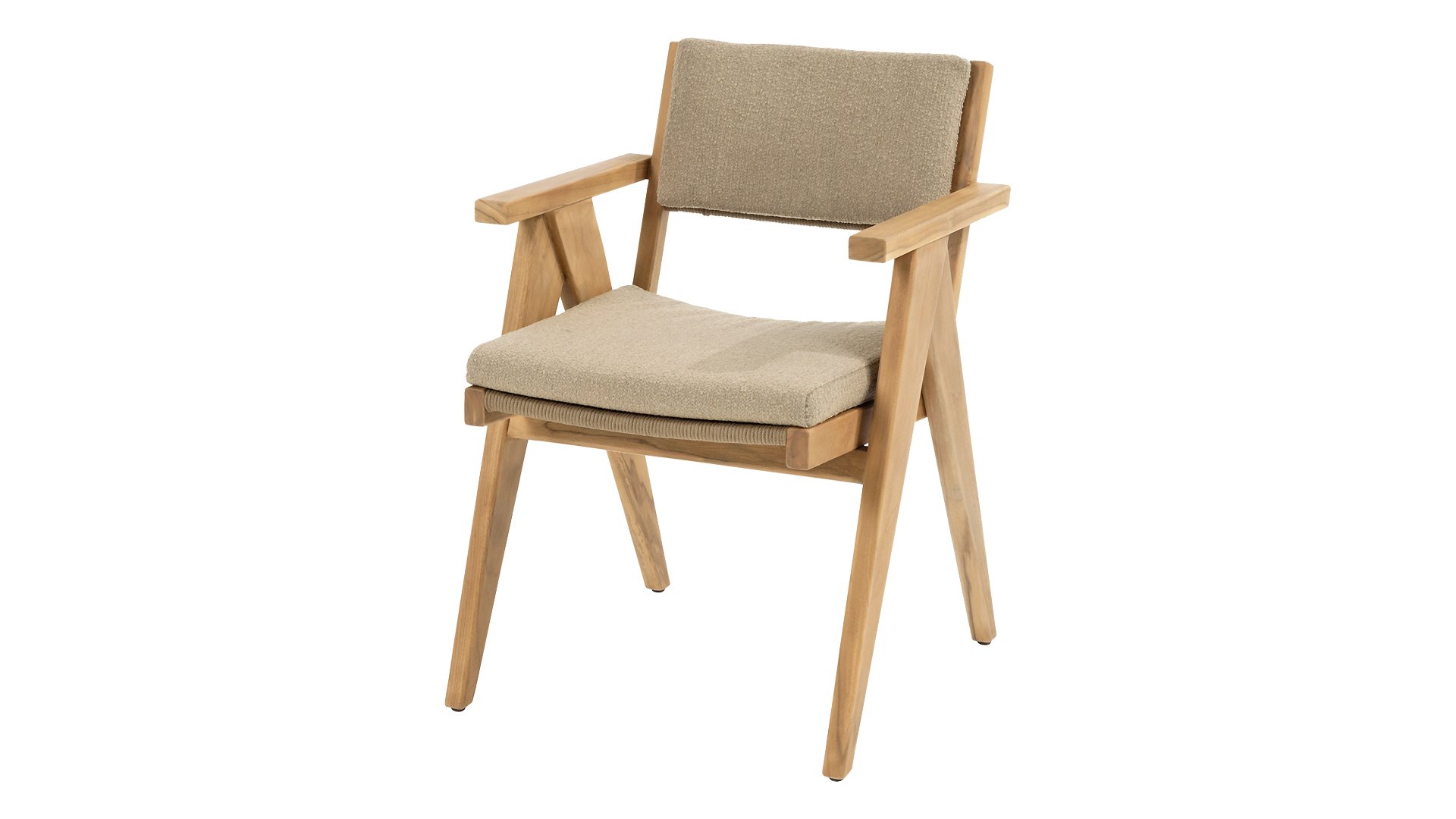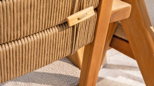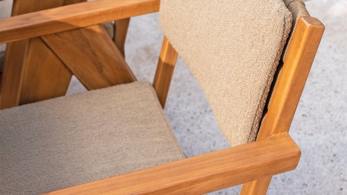 Het kussen van de stoel is gemaakt van Olefin en is gewoven in Bouclé Amber voor meer elegantie. Het bruin kleurige kussen voegt een rustgevende, neutrale tint toe die goed samenkomt met de natuurlijke uitstraling van het teakhouten frame. Het kussen is op 4 punten vastgelust aan het teakhouten frame.
