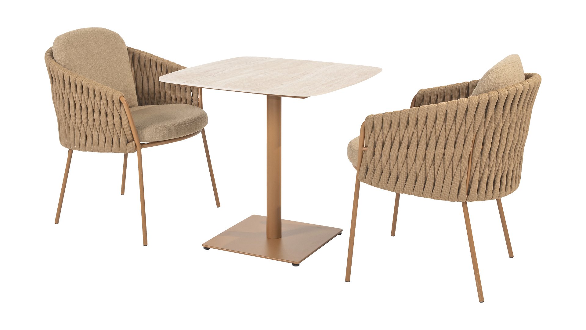 Deze tafel van 75x75 cm heeft een elegant keramieken blad dat zowel stijlvol als praktisch is. Het keramiek is niet alleen duurzaam en gemakkelijk schoon te maken, maar biedt ook een luxe uitstraling. Het onderstel is in een warme, aardse tint genaamd Amber, die perfect aansluit bij moderne en rustieke interieurs/tuinen.