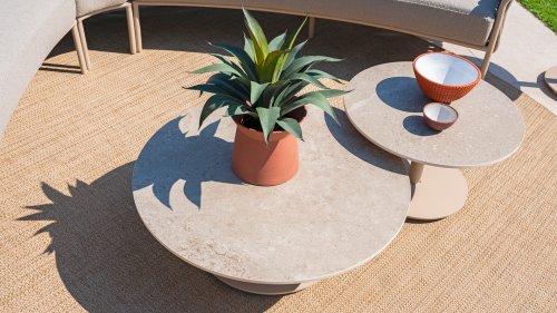 4Seasons Boaz Ontdek de schoonheid en veelzijdigheid van de 4 Seasons Outdoor Boaz ronde salontafel met zijn prachtige Ceramic tafelblad en gepoedercoate frame. Deze tafel voegt een vleugje natuurlijke elegantie toe aan uw buitenruimte en is ontworpen met aandacht voor detail. Kenmerkend is de centrale poot en de robuuste onderplaat, waardoor de 4Seasons Boaz tafel enorm stevig staat.De Boaz tafelserie bestaat uit 3 formaten en 2 kleuren Terre en Latte.