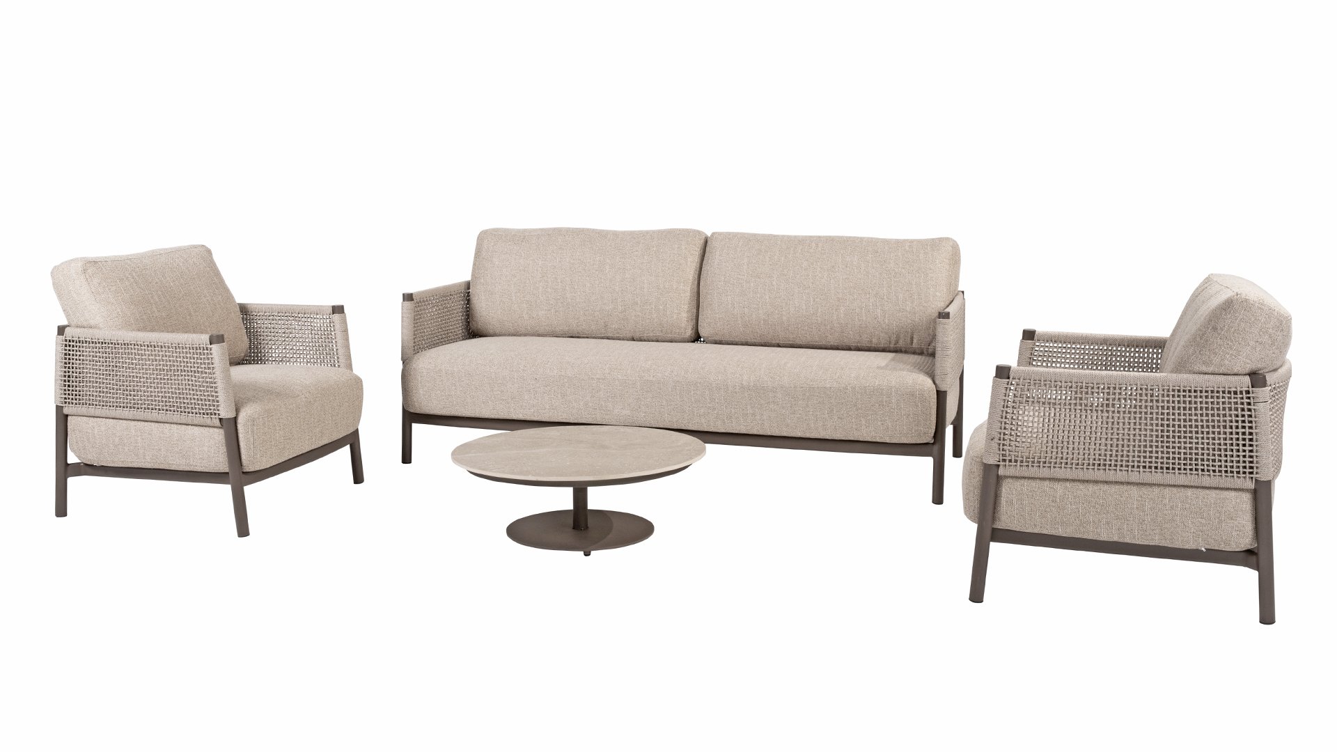 De naam Savanne komt niet zomaar uit de lucht vallen. Het loungeset is uitgevoerd in warme, natuurlijke tinten die doen denken aan de uitgestrekte Afrikaanse savannes. Het terre-gekleurde aluminium frame weerspiegelt de aardse kleuren van zandvlaktes bij zonsondergang, terwijl het unieke rope knoop-patroon verwijst naar ambachtelijke structuren en natuurlijke materialen. Het resultaat is een set die zowel rust uitstraalt als een opvallende blikvanger vormt in iedere tuin.
