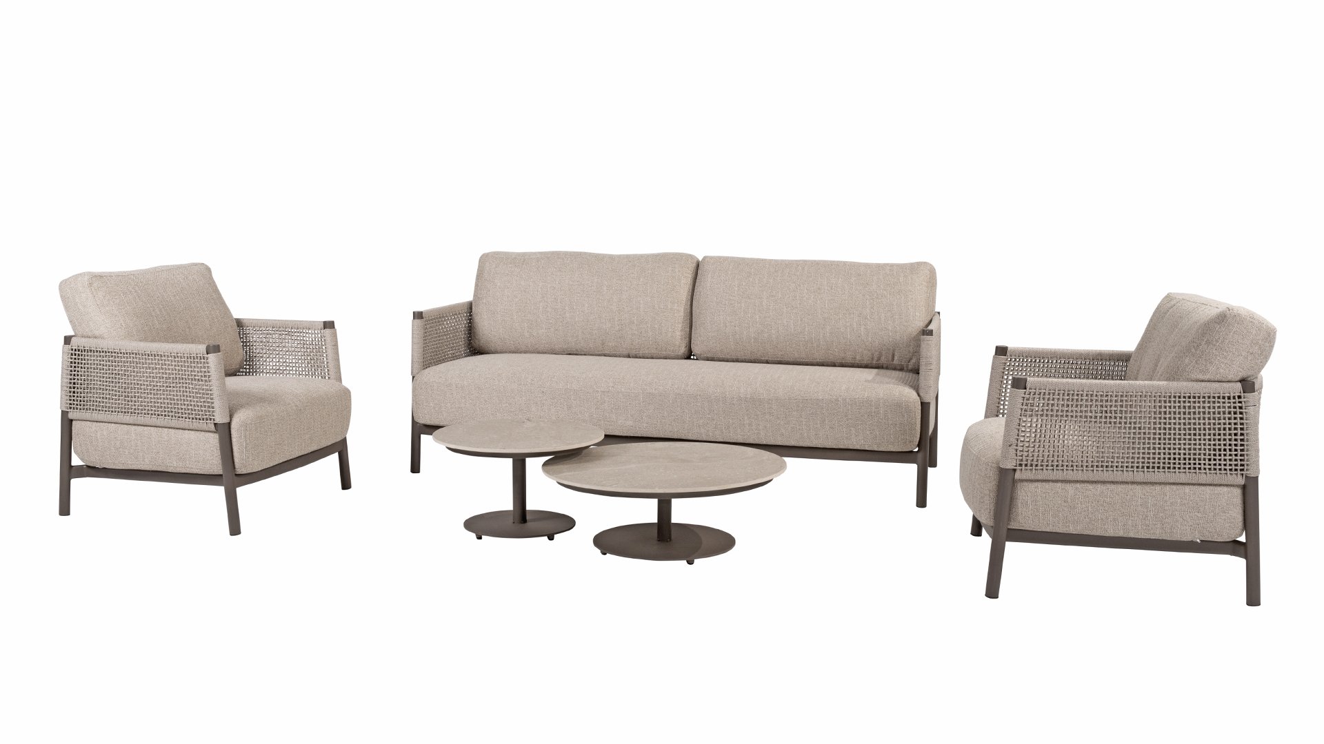 De naam Savanne komt niet zomaar uit de lucht vallen. Het loungeset is uitgevoerd in warme, natuurlijke tinten die doen denken aan de uitgestrekte Afrikaanse savannes. Het terre-gekleurde aluminium frame weerspiegelt de aardse kleuren van zandvlaktes bij zonsondergang, terwijl het unieke rope knoop-patroon verwijst naar ambachtelijke structuren en natuurlijke materialen. Het resultaat is een set die zowel rust uitstraalt als een opvallende blikvanger vormt in iedere tuin.