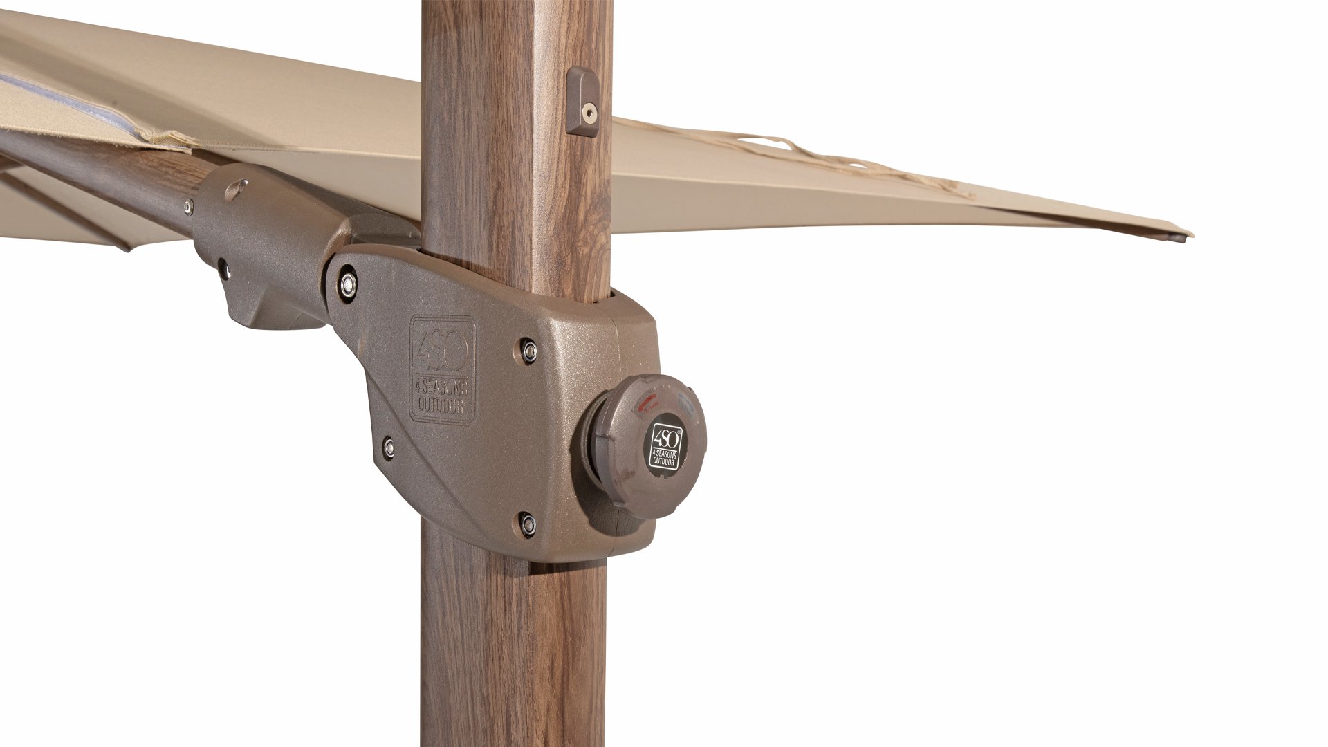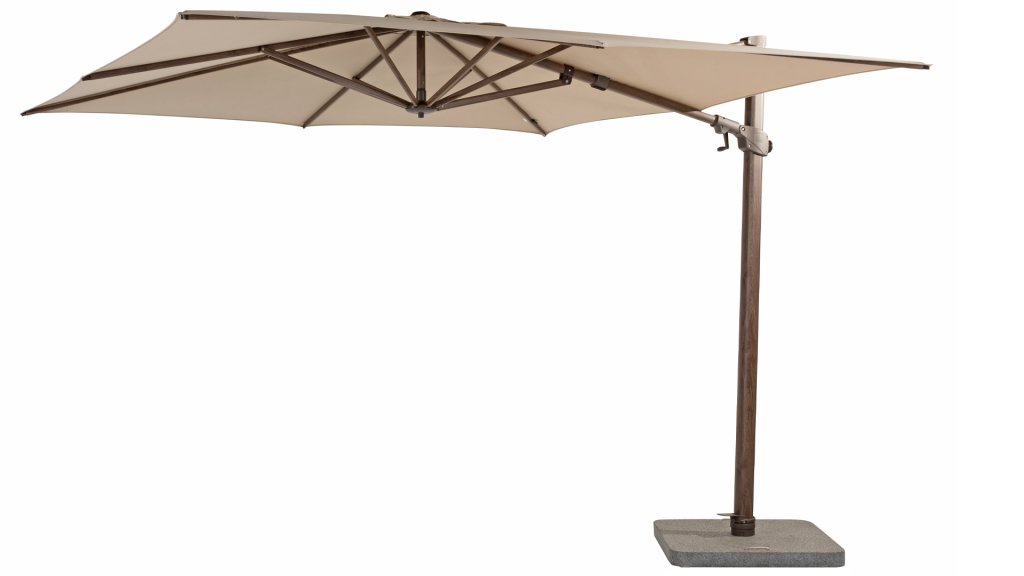 Iedere hangarmparasol van 4Seasons Outdoor kan draaien op de sokkel en naar achteren kantelen om de lage zon op te vangen. Deze premium variant kan ook zijwaards kantelen.
