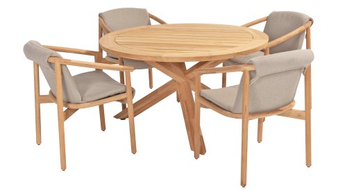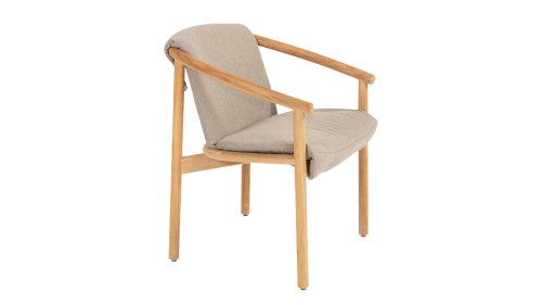Het kussen van de stoel is gemaakt van Olefin en is gewoven in Bouclé voor meer elegantie. Het taupe kleurige kussen voegt een rustgevende, neutrale tint toe die goed samenkomt met de natuurlijke uitstraling van het teakhouten frame. Het kussen is op 4 punten vastgelust aan het teakhouten frame.
