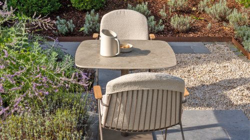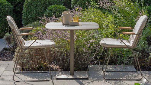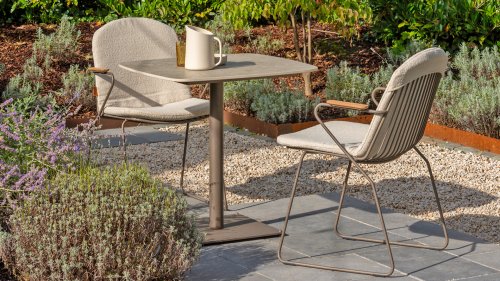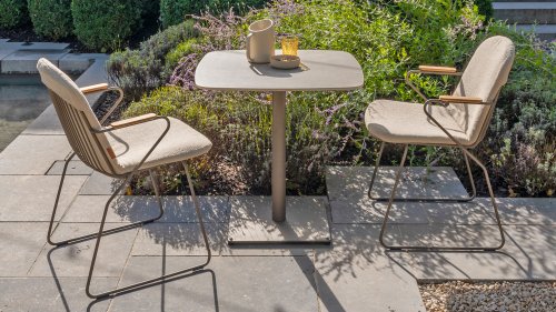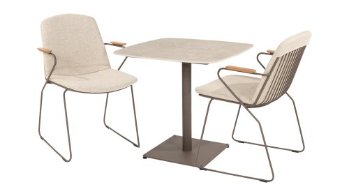 Deze tafel van 75x75 cm heeft een elegant keramieken blad dat zowel stijlvol als praktisch is. Het keramiek is niet alleen duurzaam en gemakkelijk schoon te maken, maar biedt ook een luxe uitstraling. Het onderstel is in een warme, aardse tint genaamd terre, die perfect aansluit bij moderne en rustieke interieurs/tuinen.