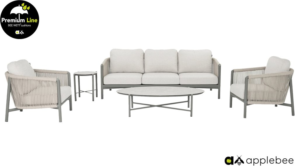 De Apple Bee Bora Bora Lounge collectie is minimalistisch, elegant en clean. Het kenmerkt zich door het tweelaags gevlochten rope, waar je doorheen kunt kijken. De fijne, gebogen vormen van dit meubel zorgt voor een strak maar toch elegant aanzicht. In combinatie het harmonieuze samenspel van de taupe kleuren en het rope is de luxueuze Bora Bora een prachtige toevoeging in de tuin. Uiteraard is deze lounge set ook weer uitgerust met de Bee Wett® kussens. Deze Bee Wett® kussens zijn speciale weerbestendige kussens. Het open weefsel aan de onderzijde van het kussen zorgt voor een perfecte drainage. Dit zorgt ervoor dat jouw Bee Wett kussen spectaculair veel sneller droogt dan andere kussens. Daarnaast is de stof bestand tegen rot en schimmels, Uv-bestendig, vochtwerend, zacht en comfortabel.