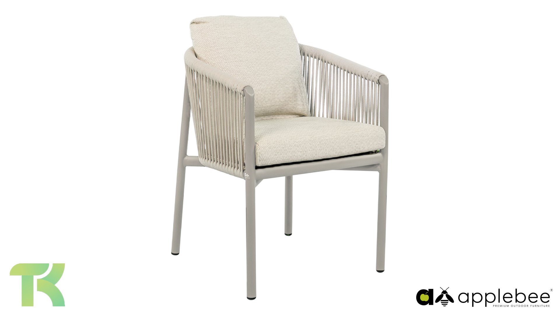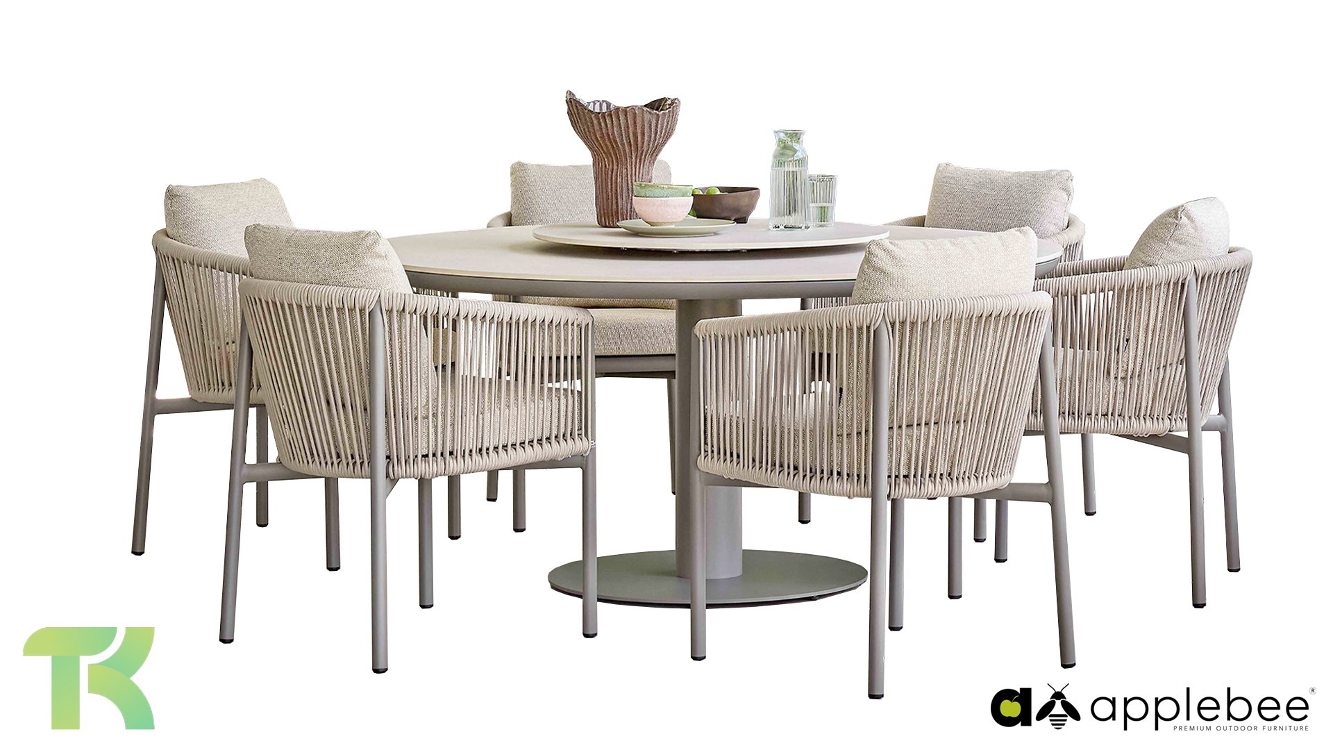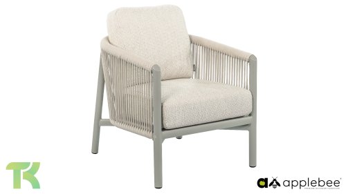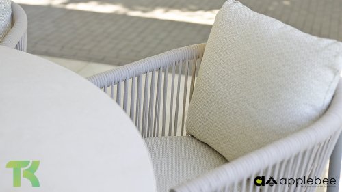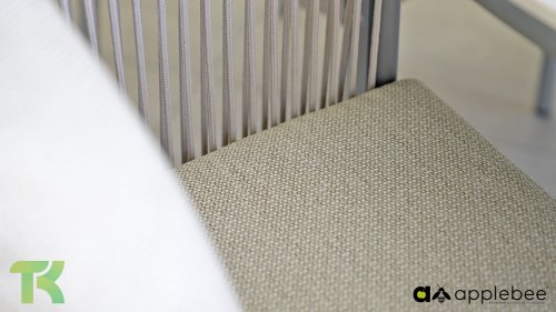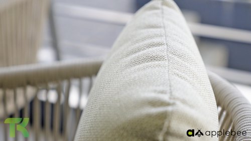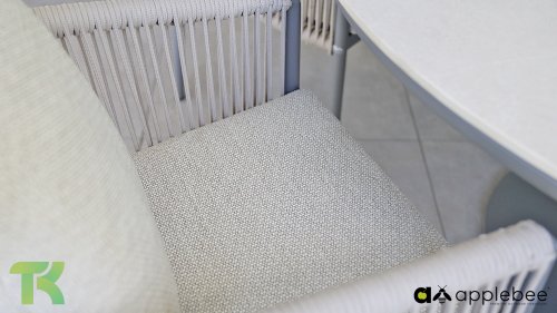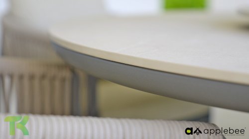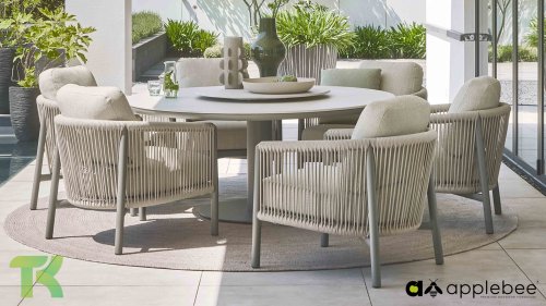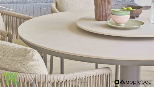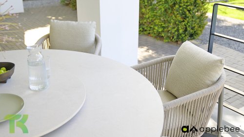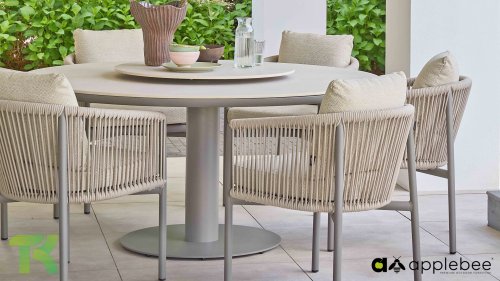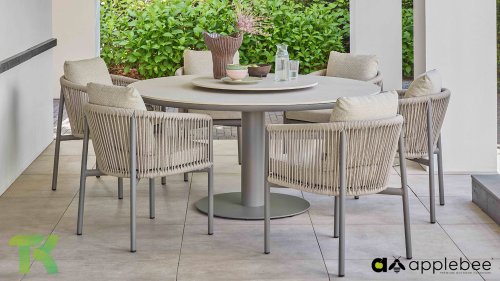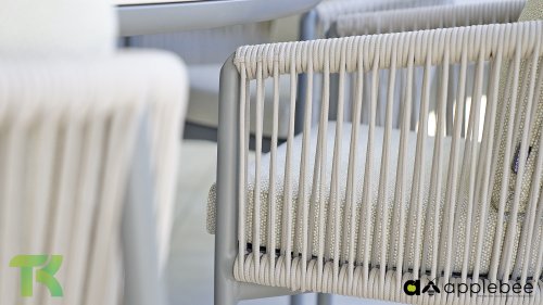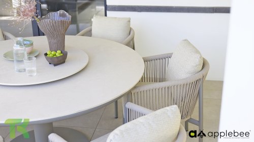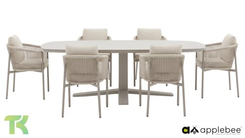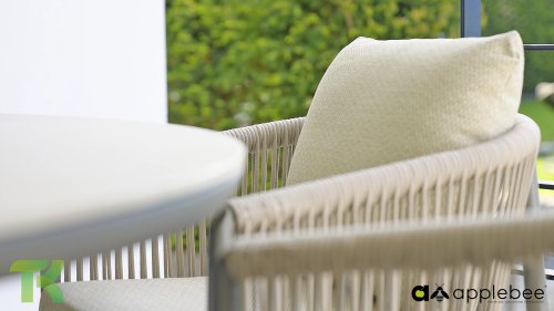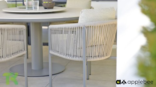Voor wie van uitgebreid tafelen houdt zonder in te leveren op een luxe uitstraling, is er de Apple Bee Bora Bora Dining. Het ontwerp is een meesterwerk van modern design. Het verfijnde aluminium frame in de kleur warm taupe vormt een prachtig contrast met het dubbelgevlochten rope in de natuurlijke kleur Oak. Dit vlechtwerk geeft de stoelen een luchtig en transparant karakter, terwijl de licht gebogen rugleuning en de royaal gevulde kussens zorgen voor een actieve, maar uiterst comfortabele zit.