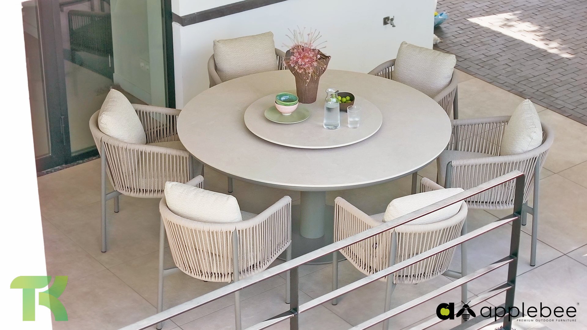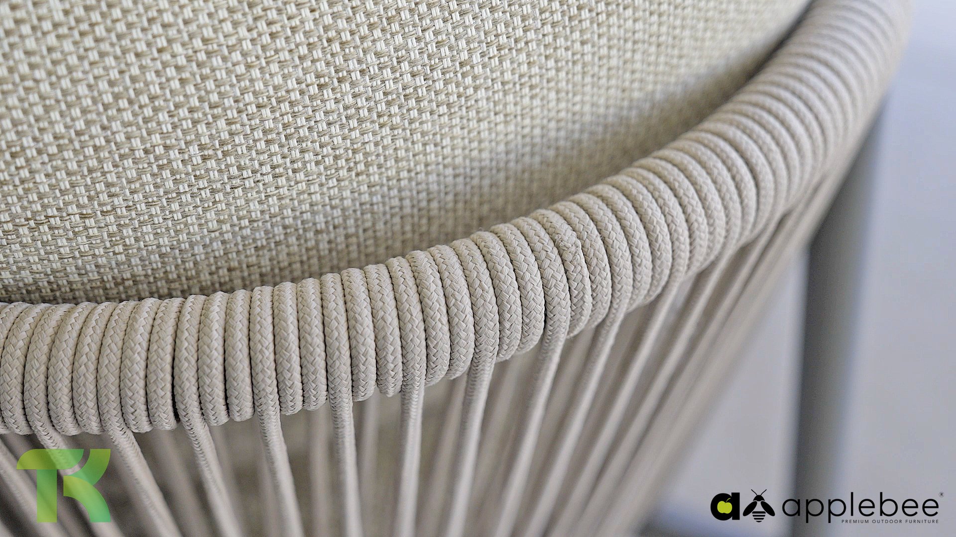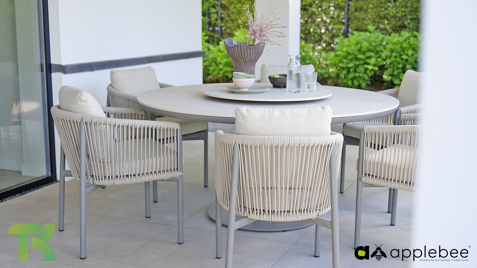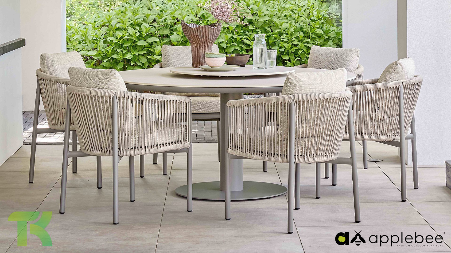 Voor wie van uitgebreid tafelen houdt zonder in te leveren op een luxe uitstraling, is er de Apple Bee Bora Bora Dining. Het ontwerp is een meesterwerk van modern design. Het verfijnde aluminium frame in de kleur warm taupe vormt een prachtig contrast met het dubbelgevlochten rope in de natuurlijke kleur Oak. Dit vlechtwerk geeft de stoelen een luchtig en transparant karakter, terwijl de licht gebogen rugleuning en de royaal gevulde kussens zorgen voor een actieve, maar uiterst comfortabele zit.